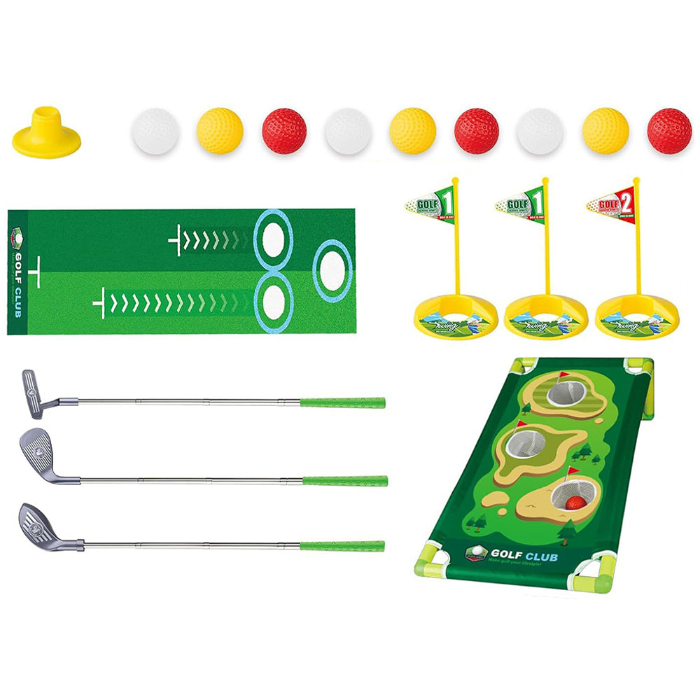 - This golf set includes 1 golf mat, 3 golf tees, 3 adjustable golf clubs, 9 golf balls, 3 practice holes, and 1 golf cornhole board, providing everything needed for a fun and engaging golf experience.