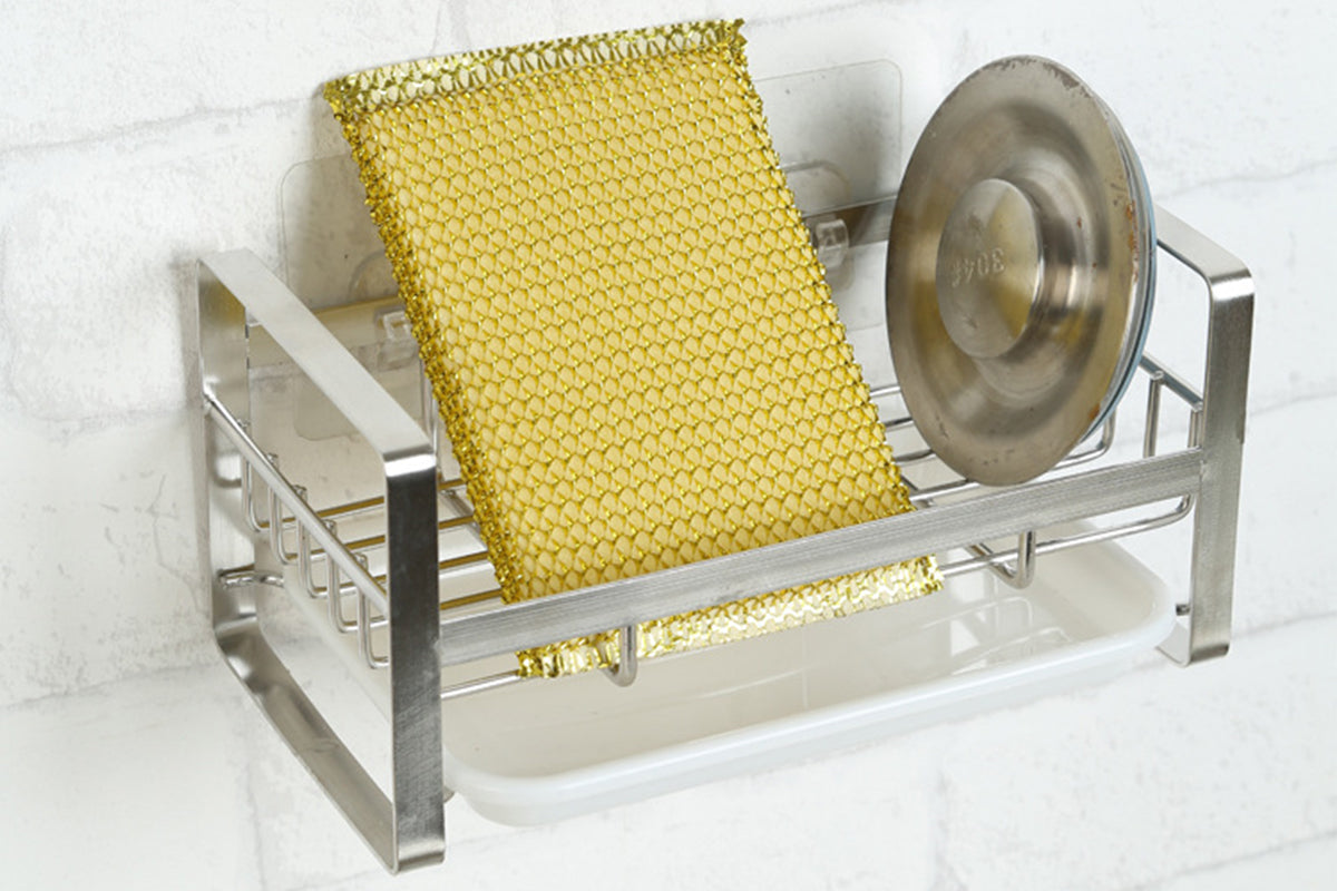 Kitchen Sink Stainless Steel Sponge Holder With Brush Rack Removable Drain Tray-Silver