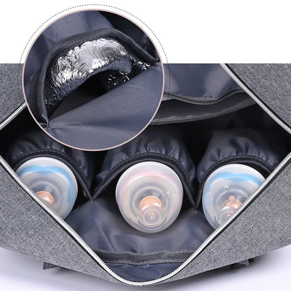 - Features one large zipped main compartment with 3 inner insulated pockets to keep baby milk bottles warm.