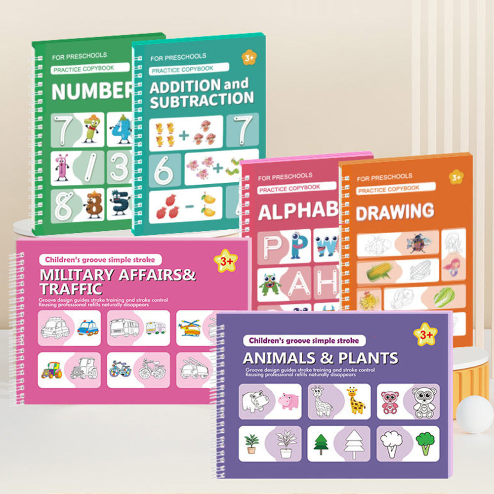 - It can master writing skills by practicing alphabet, numbers, words, math, and drawing in 6 themed grooved handwriting books.?