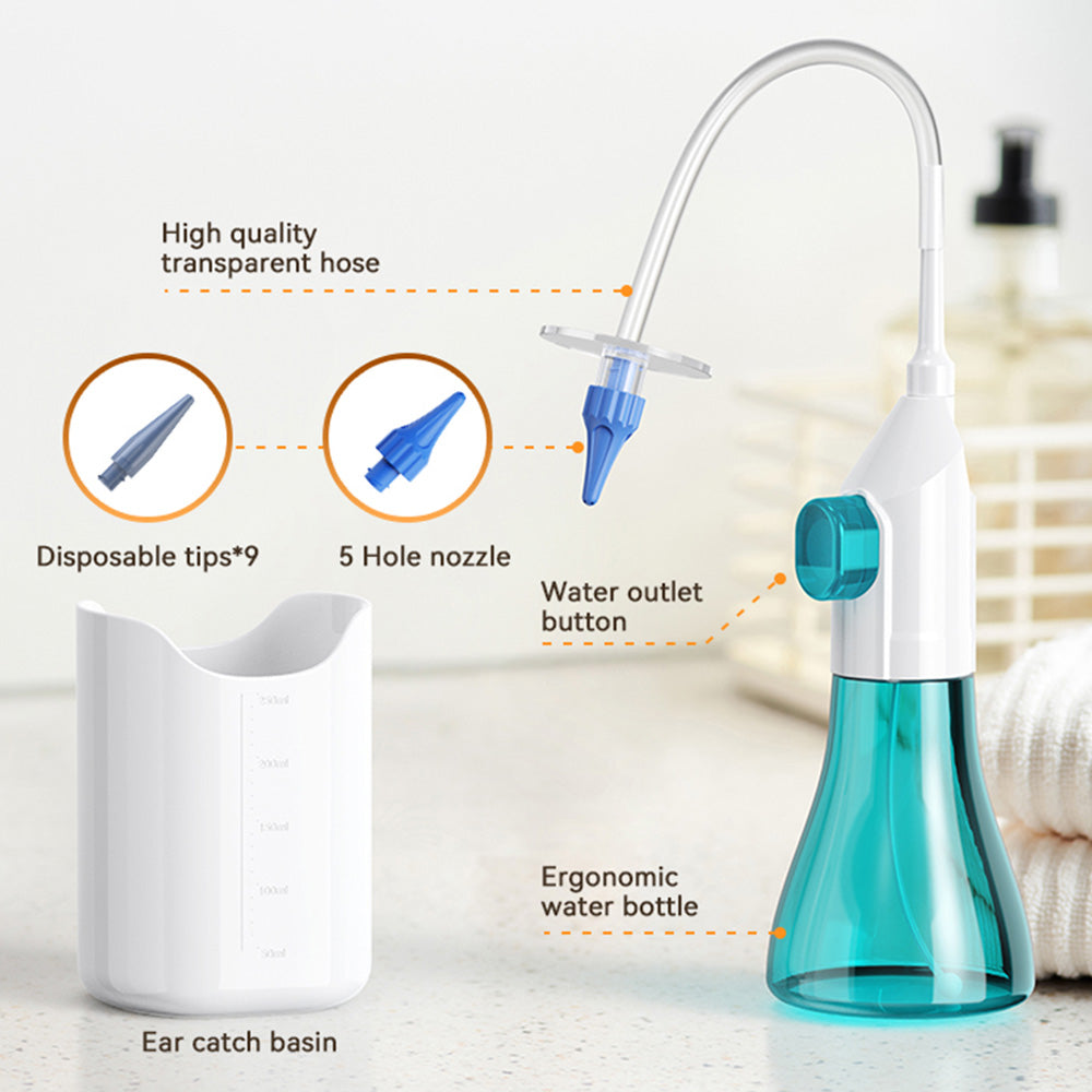 - Set includes 1x main machine, 1x ear catch basin, 1x unique soft spray irrigation tip, 10x soft ear tips, 1x user manual.