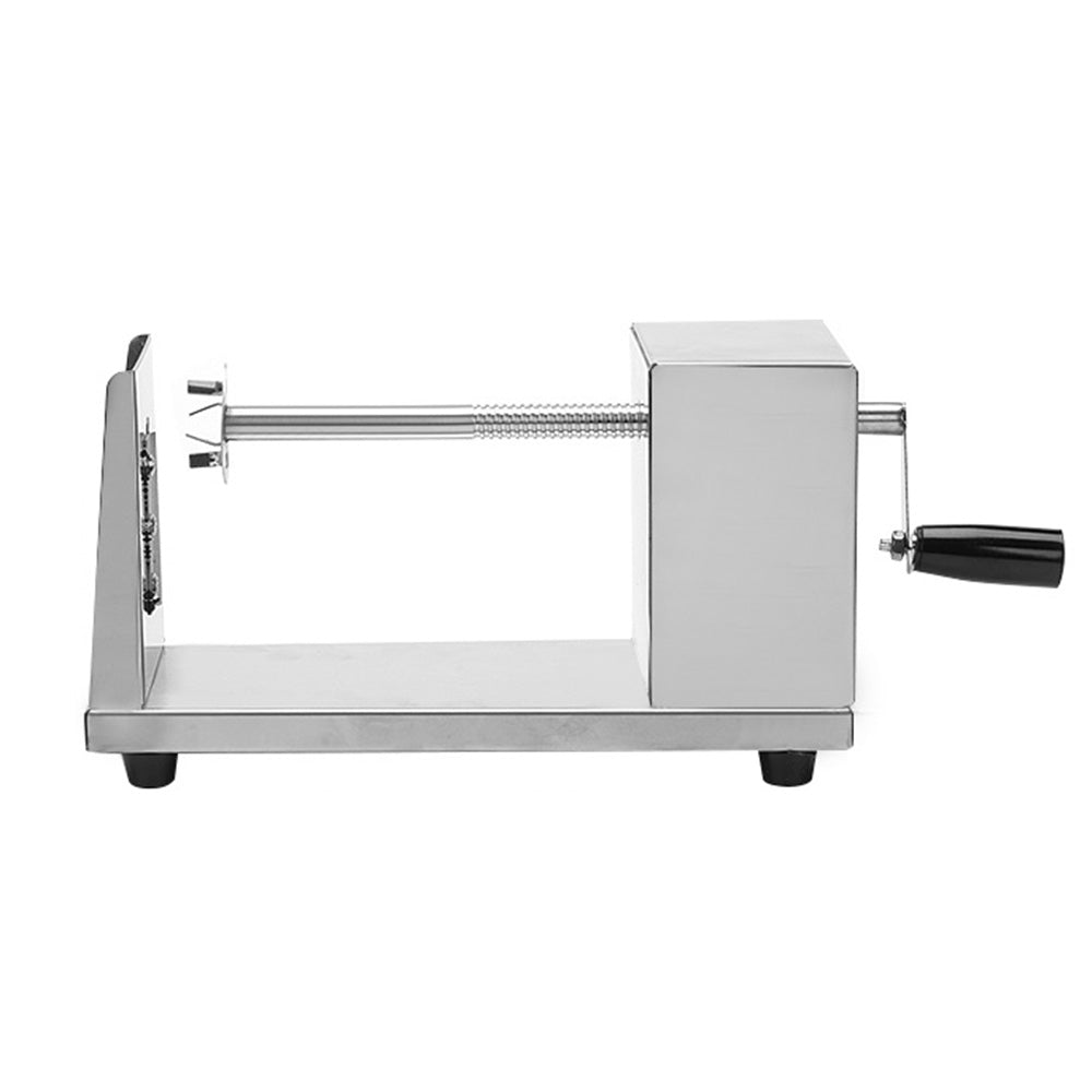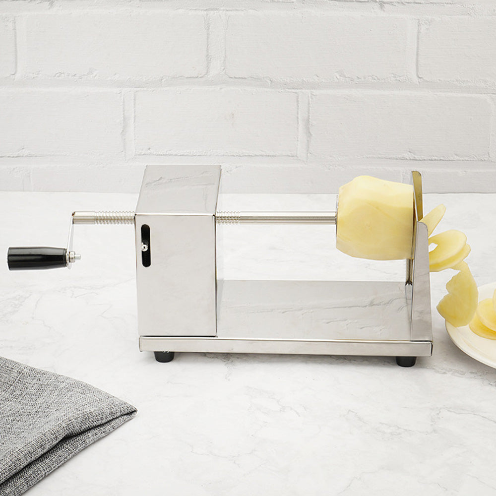 - This manual potato spiral slicer features durable stainless steel construction and a convenient hand-crank design, perfect for creating spiral-cut potatoes and vegetables at home or small shops.