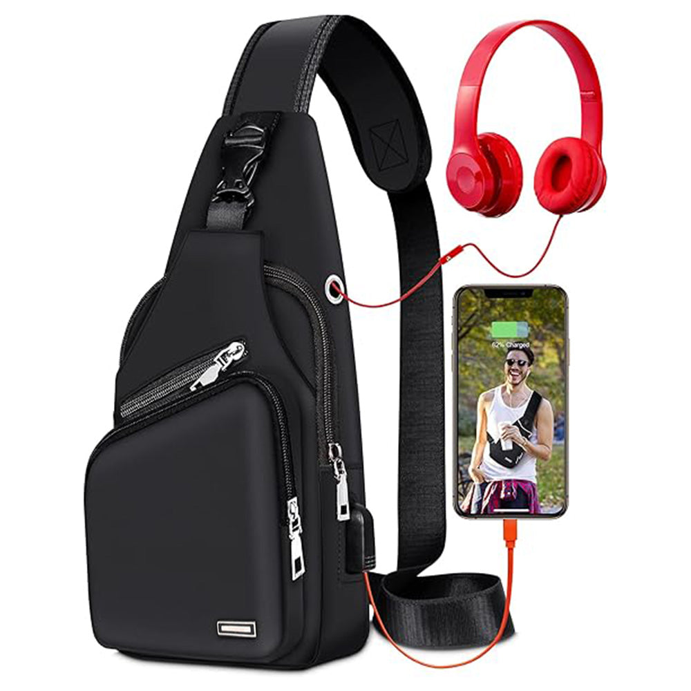 - The crossbody bag includes a USB hole and headphone hole (without a portable charger or headphones), allowing you to conveniently charge your phone via the USB charging port.