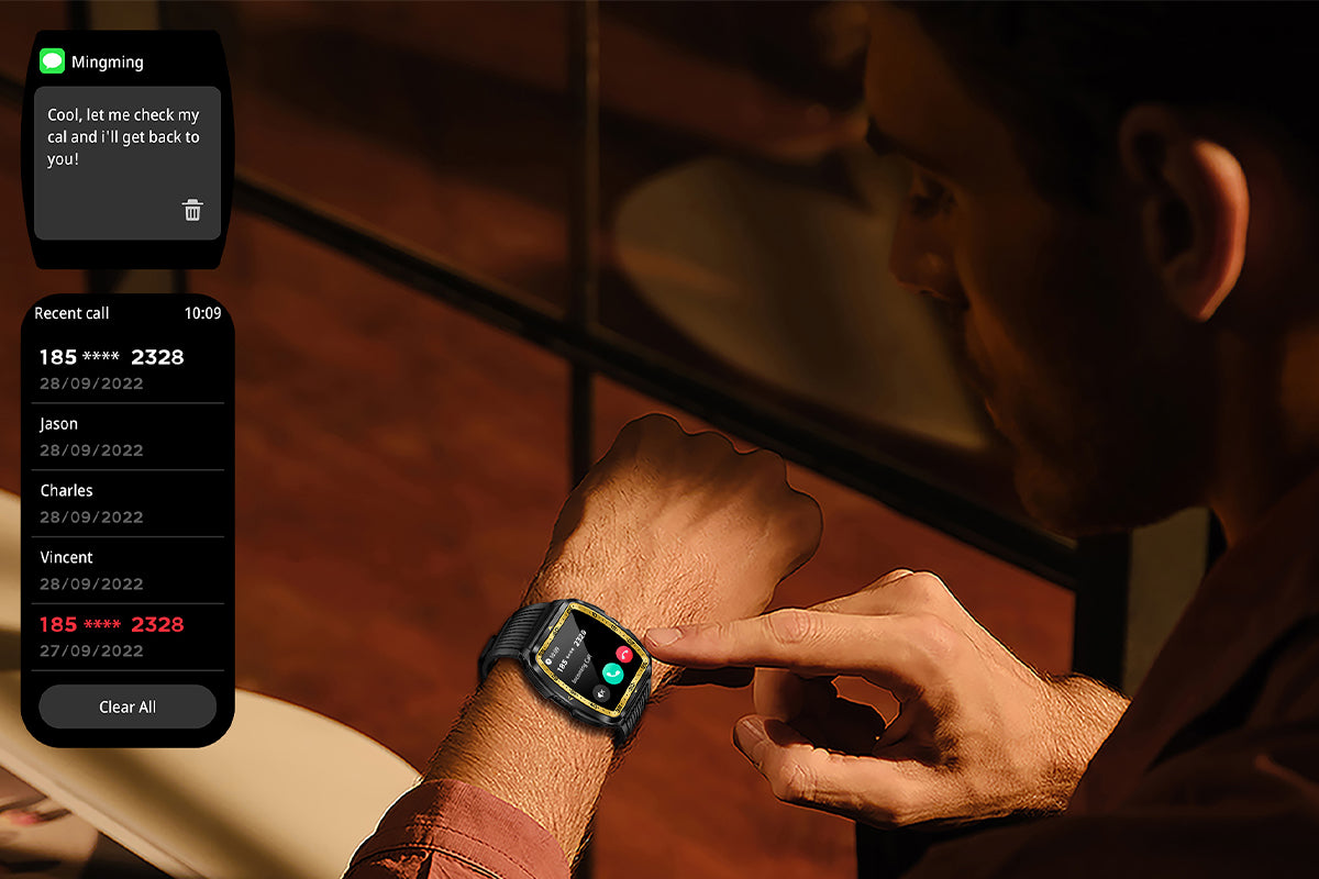 - Enables voice assistant operation call and notification viewing music and camera control plus step counting and weather checking through the DAFit companion app