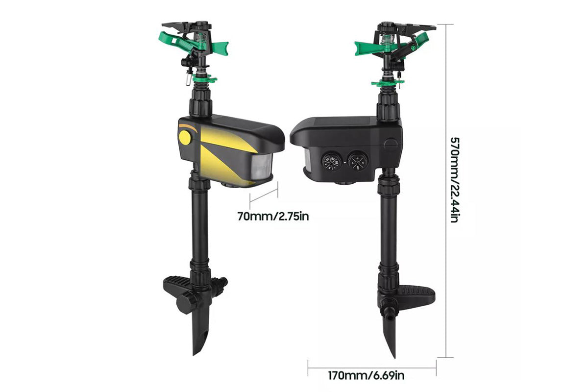 - When animals enter the PIR sensor range, the sprinkler releases a strong water jet and clicking sound to scare them away effectively.