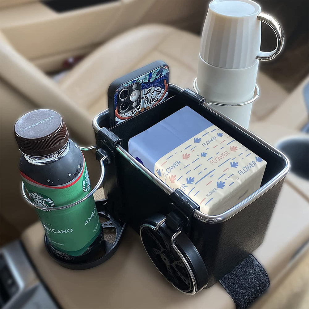 - The armrest storage box is equipped with 2 foldable cup holders, you can use the cup holders to place water cups, and stack the cup holders to save space when not in use.