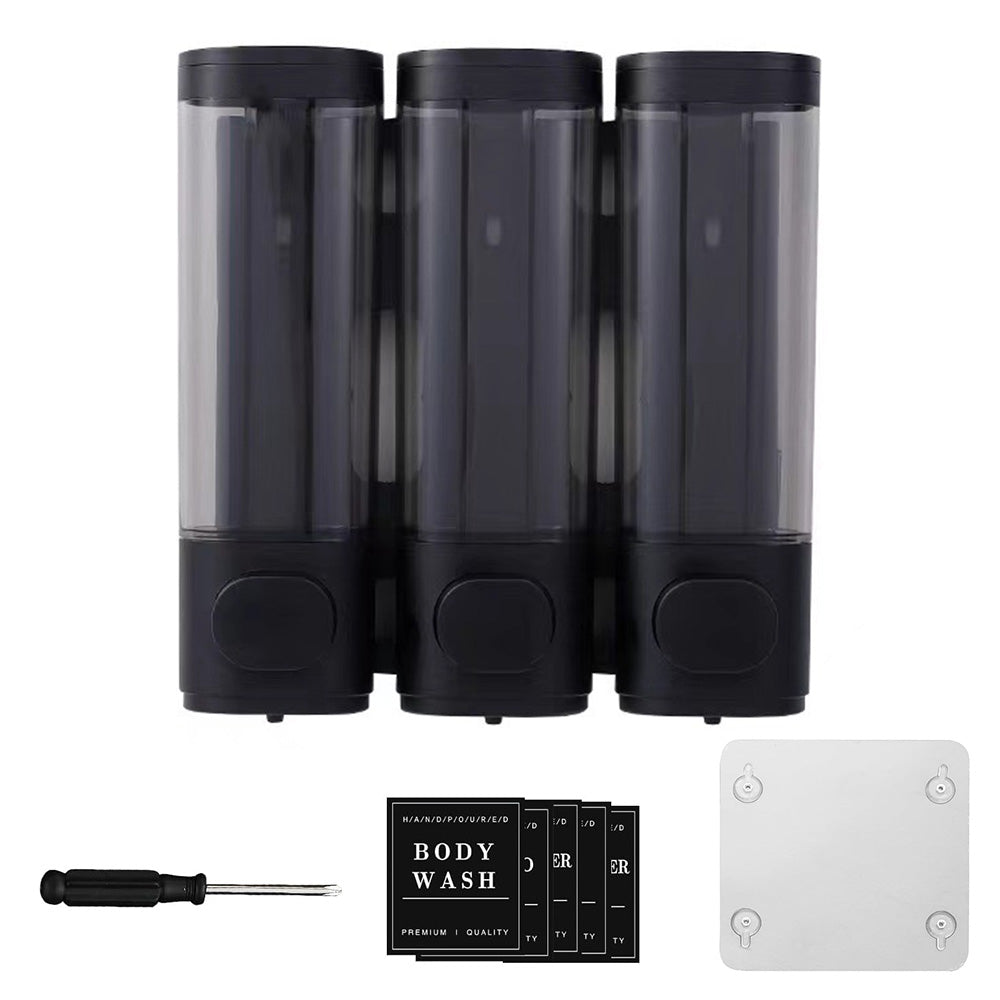 - Keep your bathroom organized and hygienic with this no-drill wall-mounted triple soap dispenser. Perfect for homes, hotels, or shared bathrooms, it provides convenient access to shampoo, conditioner, and body wash while saving space and eliminating messy spills.