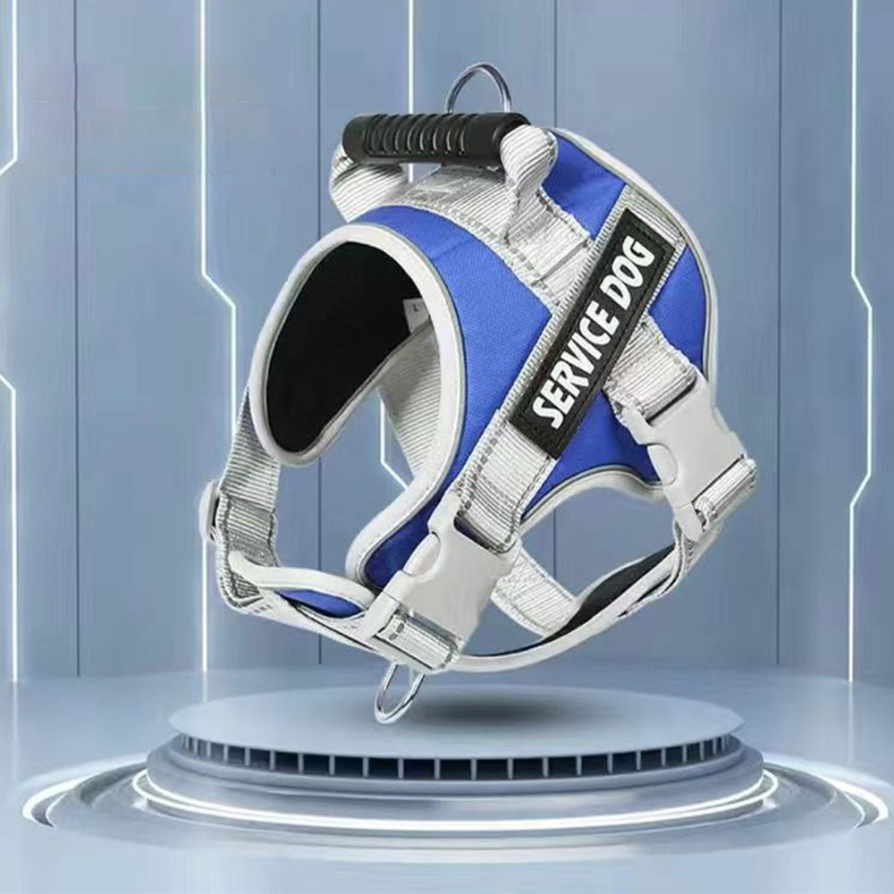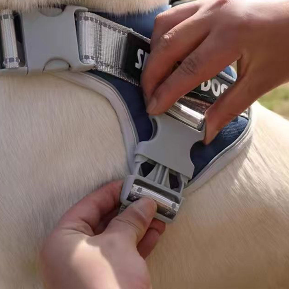 Adjustable no-pull dog harness with reflective strips, designed to provide secure support and visibility during walks.