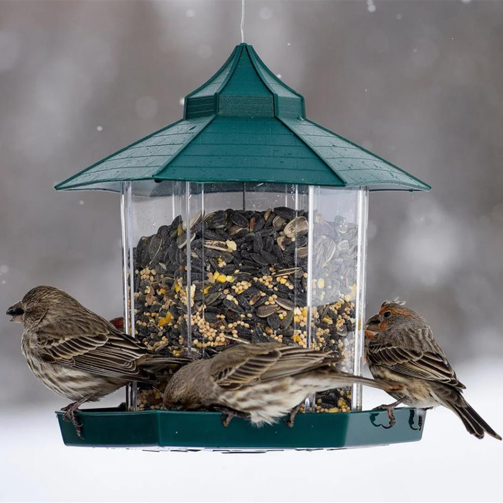 - Features beautiful gazebo design, its inclined roof to protect bird food from rain.