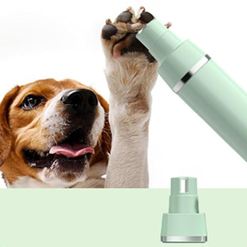 - The device features four interchangeable heads: a curved scissors head, a nail grinder head, a paw hair trimmer head, and a shaving head.