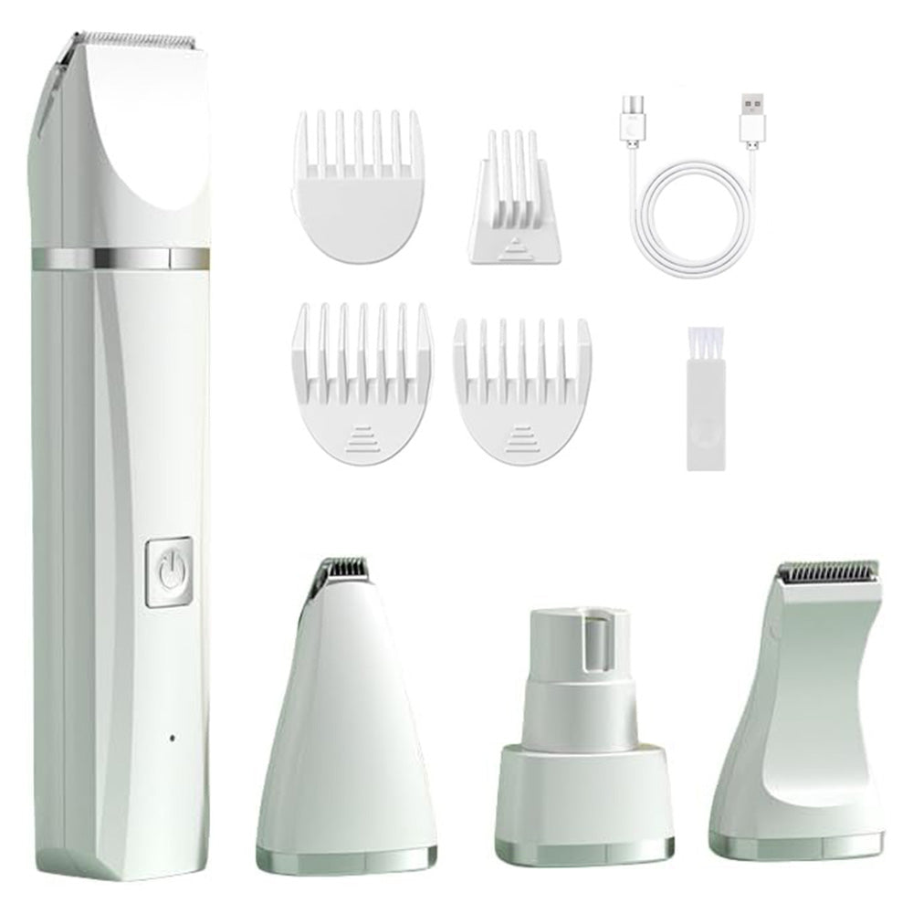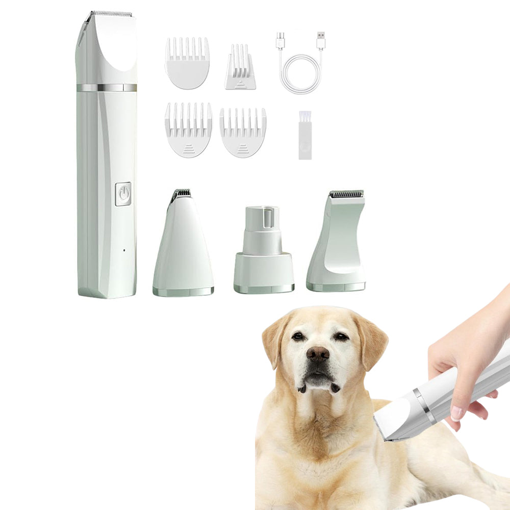 - The device features four interchangeable heads: a curved scissors head, a nail grinder head, a paw hair trimmer head, and a shaving head.
