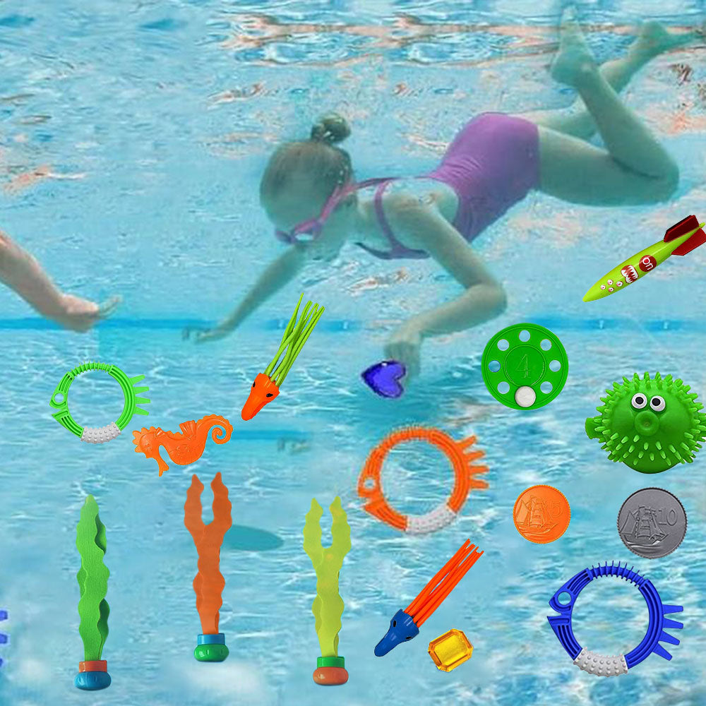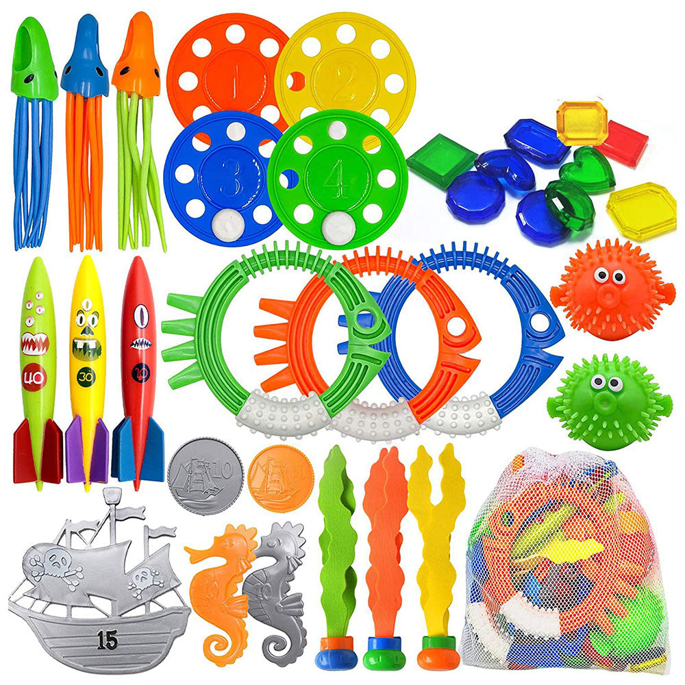 The kids and pets pool diving toys set includes vibrant, durable toys that enhance fun and swimming skills for both kids and pets during pool playtime.