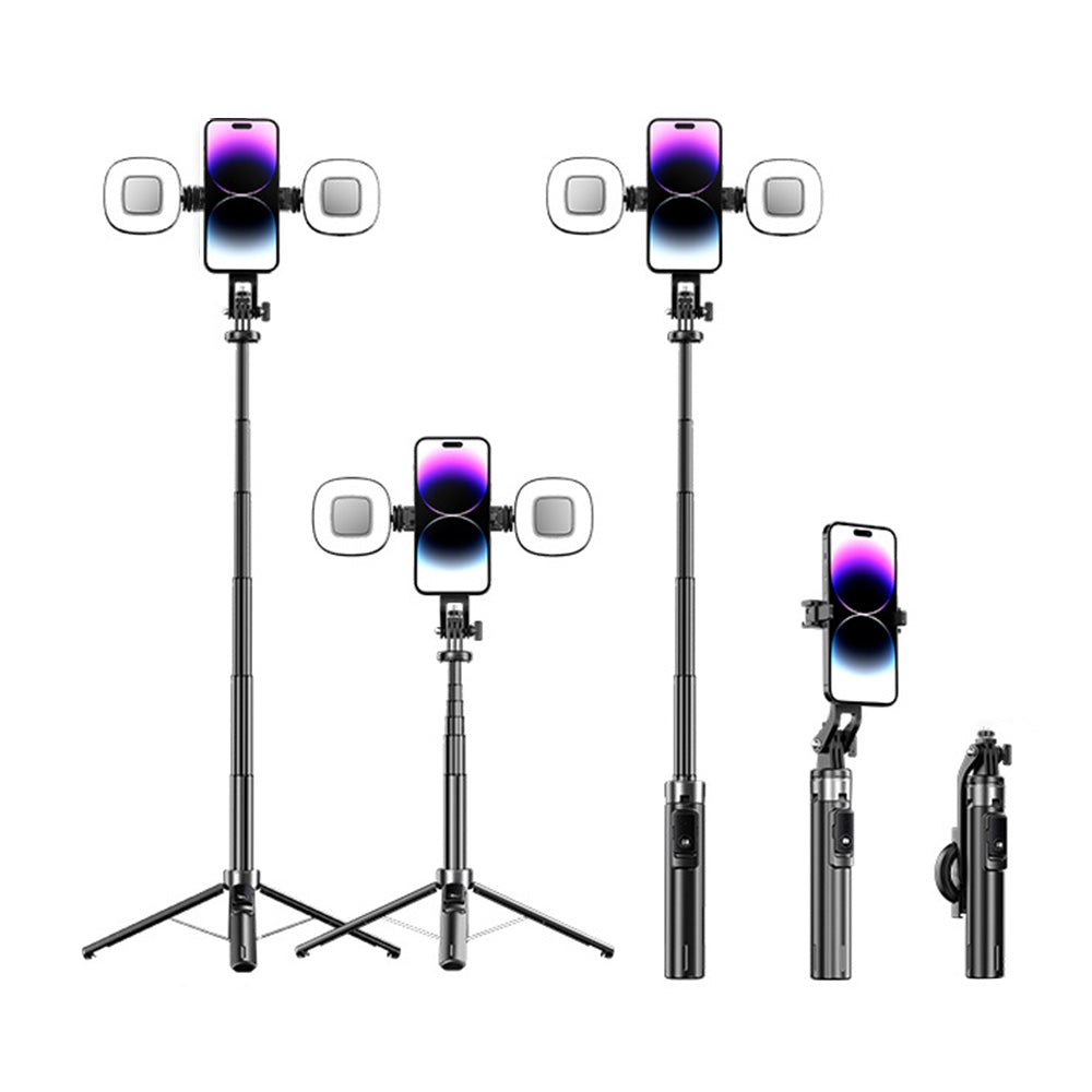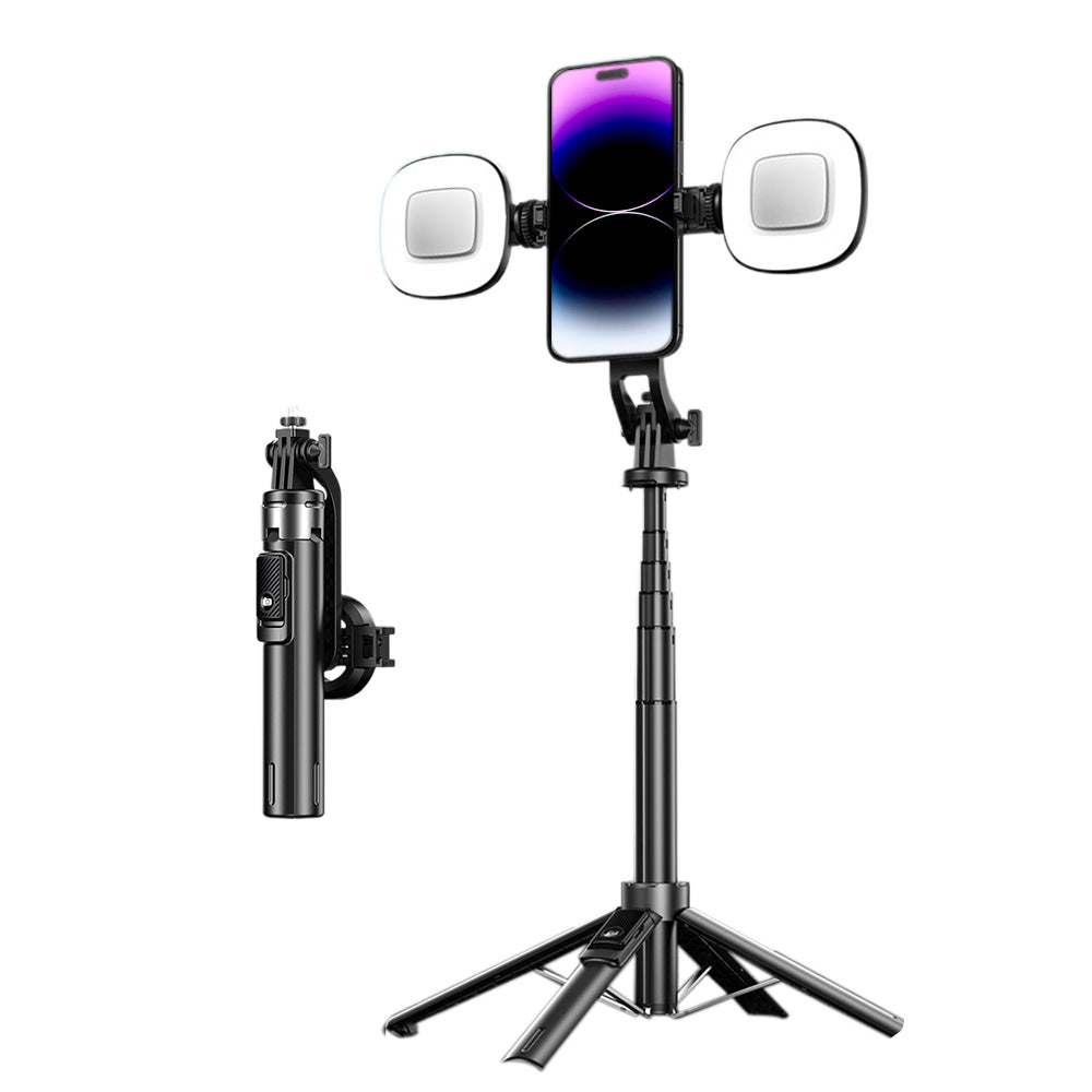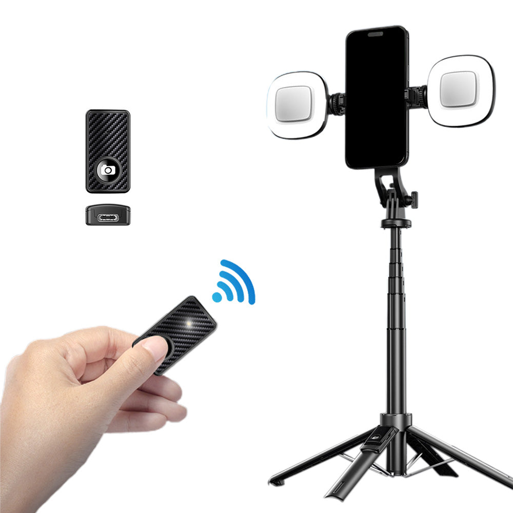 Portable Phone Tripod Stand Retractable Selfie Stick with Remote Control and Fill Light for Photograph Video Recording Black