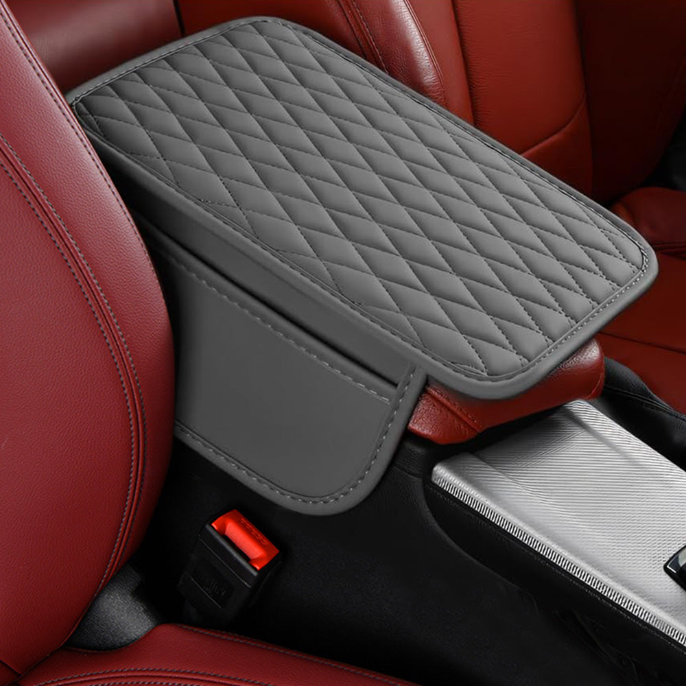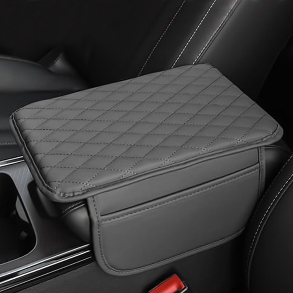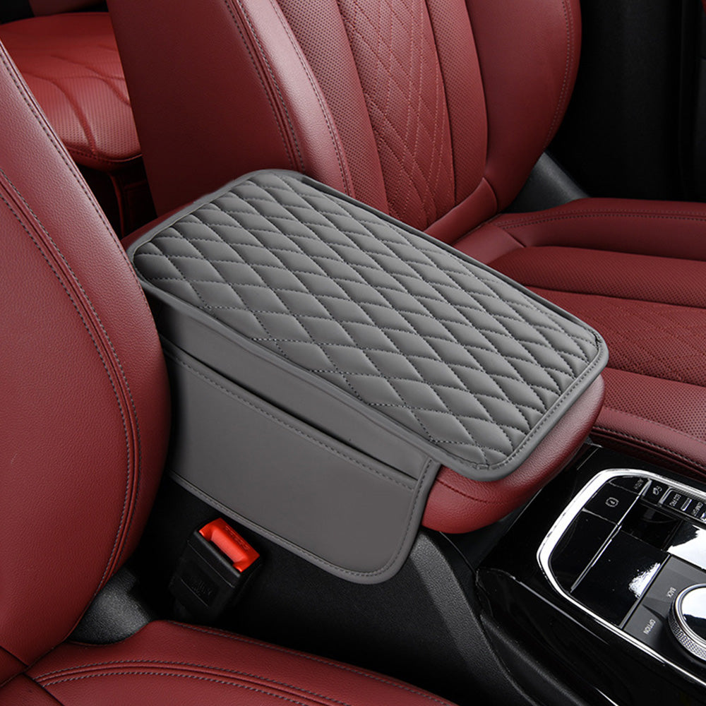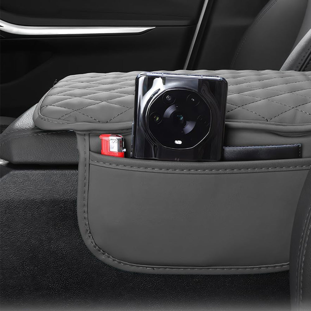 Upgrade your car interior with this ergonomic leather armrest cover, featuring dual side storage pockets for added convenience.