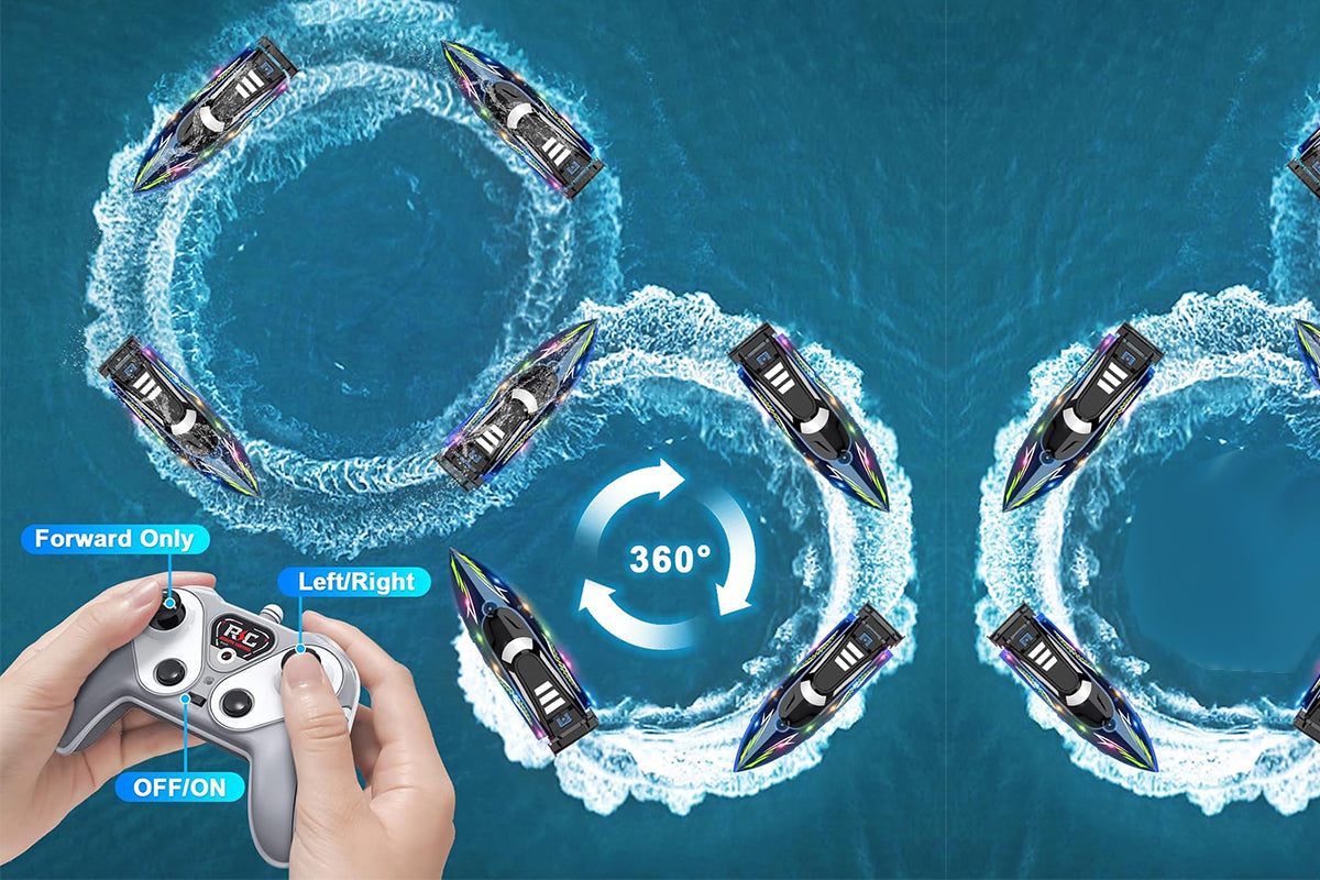 - Experience high-speed aquatic thrills with this 50km/h remote control boat featuring dual motors, vibrant LED lighting modes, and a 2.4GHz transmitter for racing with friends