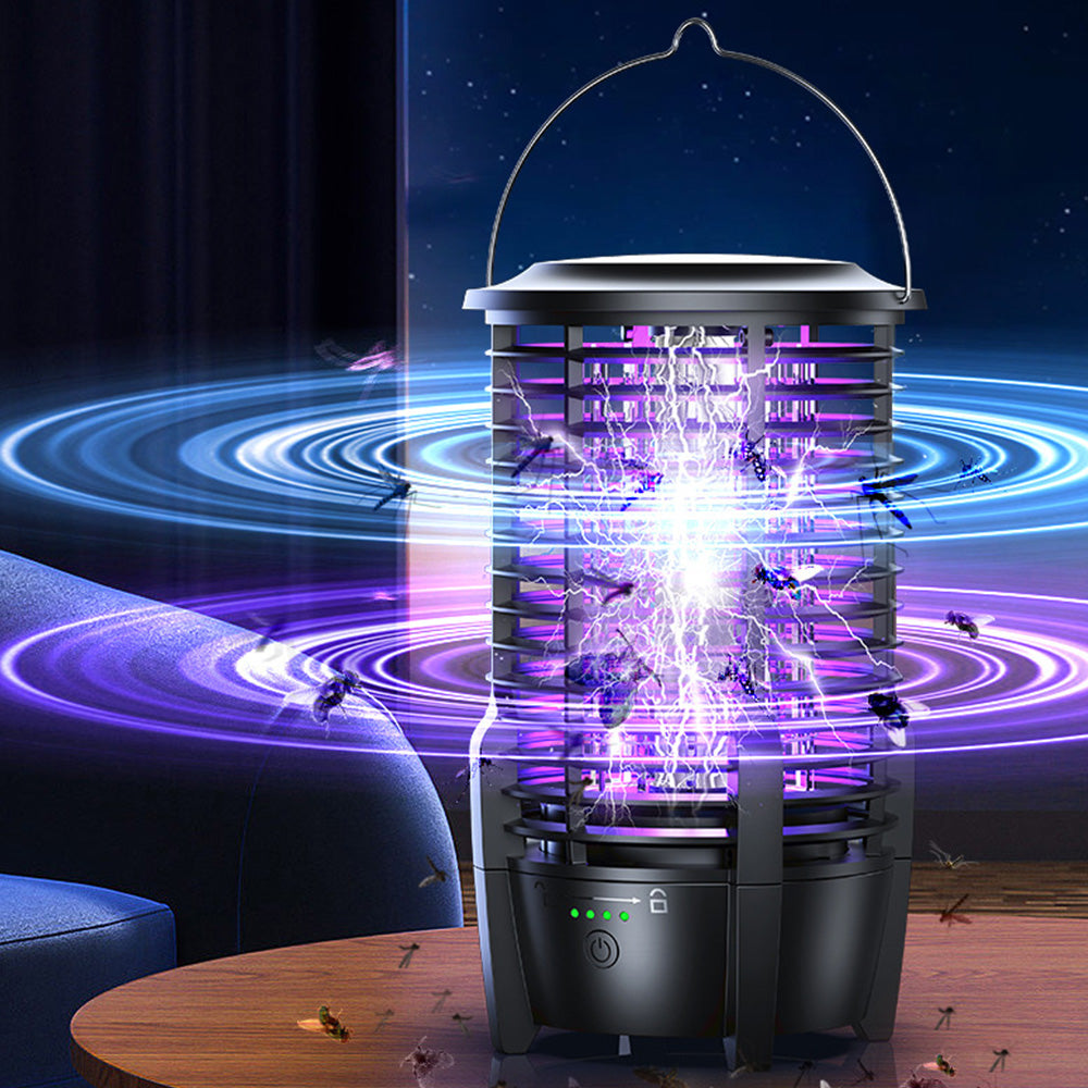 Attracts and kills flying insects with bionic frequency light waves and powerful electric shock. Designed for safe, silent, and efficient mosquito control indoors or during outdoor camping.