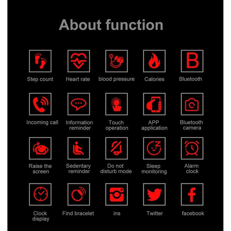 Multifunctional, Bluetooth connection, phone call reminder, receive information display, health tracker, pedometer, calories counter, distance, sleep monitor, sedentary reminder, heart rate monitor, etc