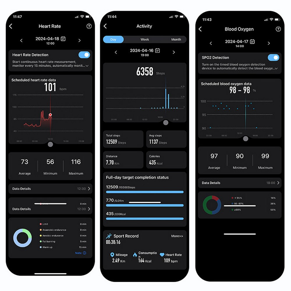 - Major function:Steps,distance,calorie calculation,heart rate,blood oxygen saturation,blood pressure,sleep tracking,multiple sports modes