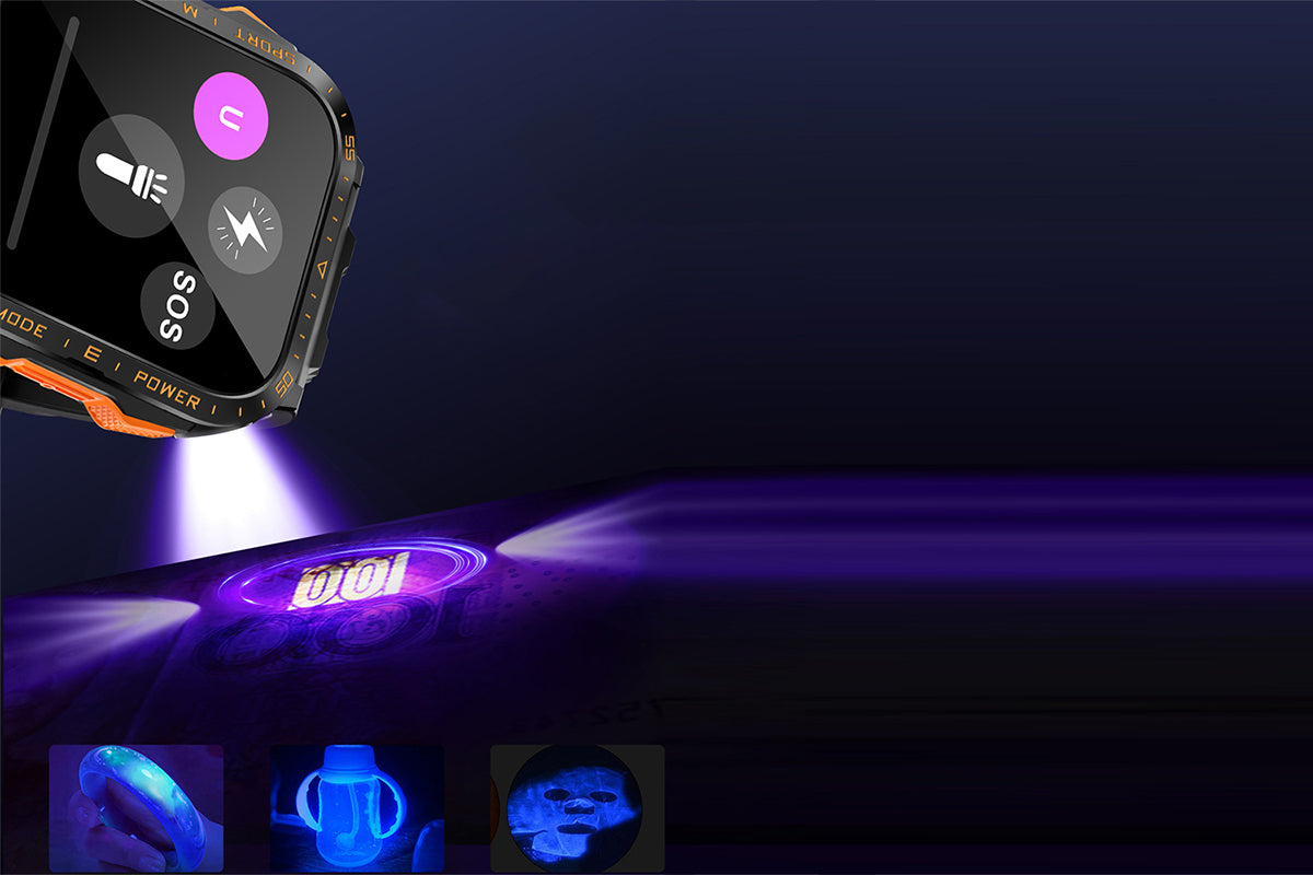 - The watch features both UV light for authenticity verification and a powerful 20-meter range spotlight with multiple modes including high beam, strobe and SOS emergency signal.