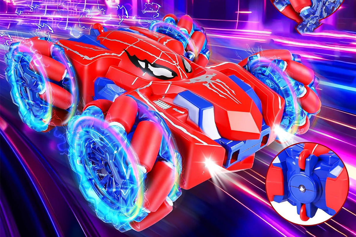 - Designed with a unique spider-inspired look and dazzling LED-lit wheels, this high-performance stunt car captures boys and girls; attention day or night.