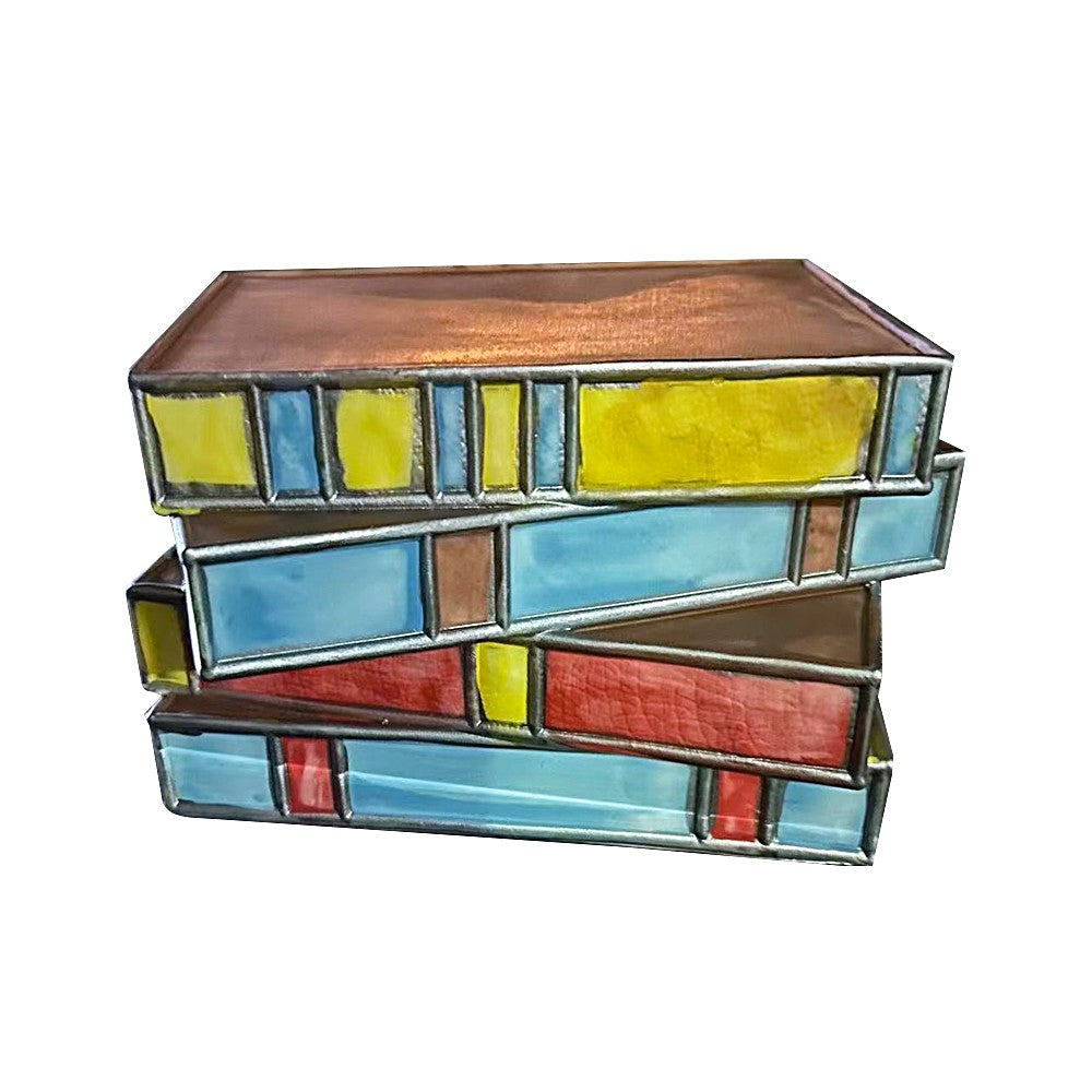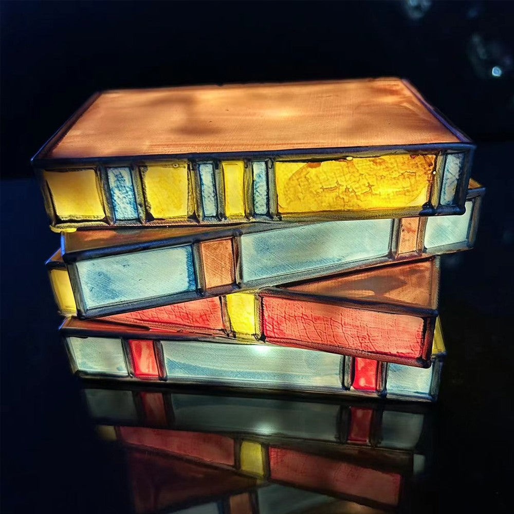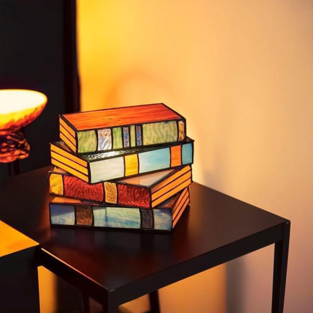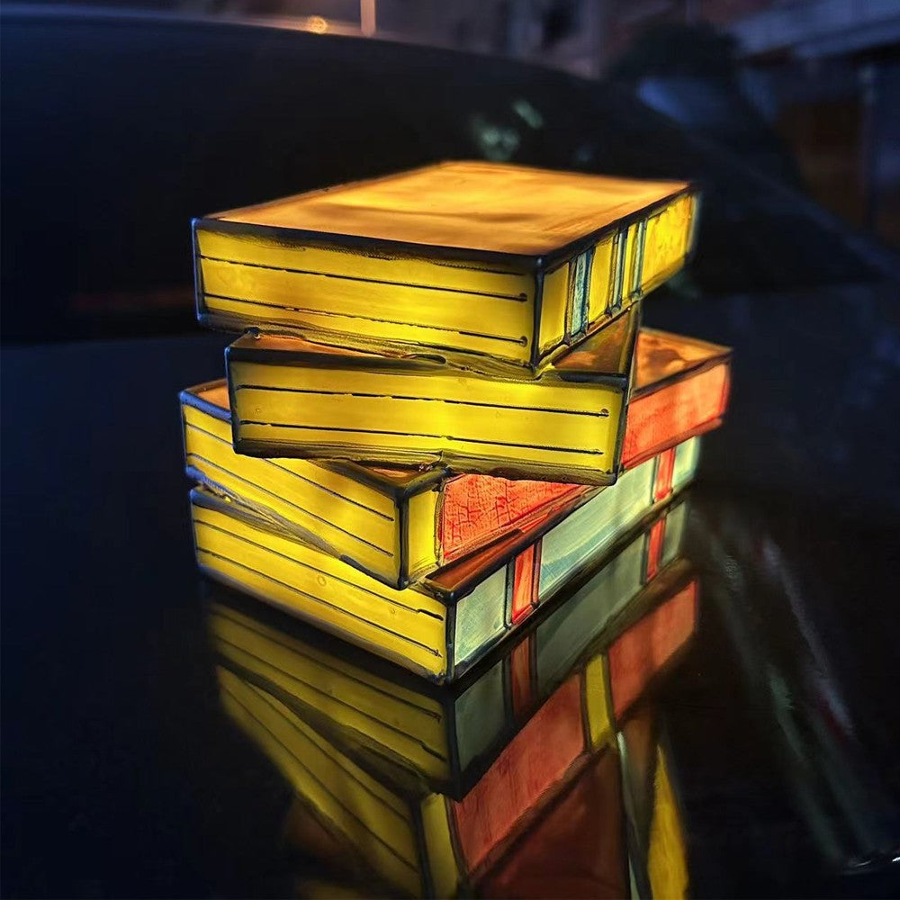 - The stacked books lamp is rich in creativity, featuring a three-dimensional book shape composed of layered books.