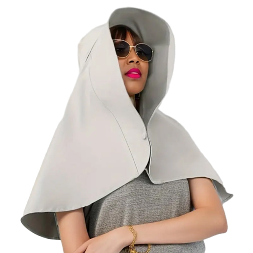 An oversized sun hat with an exceptionally wide brim and integrated shawl, designed to provide extensive protection from the sun.
