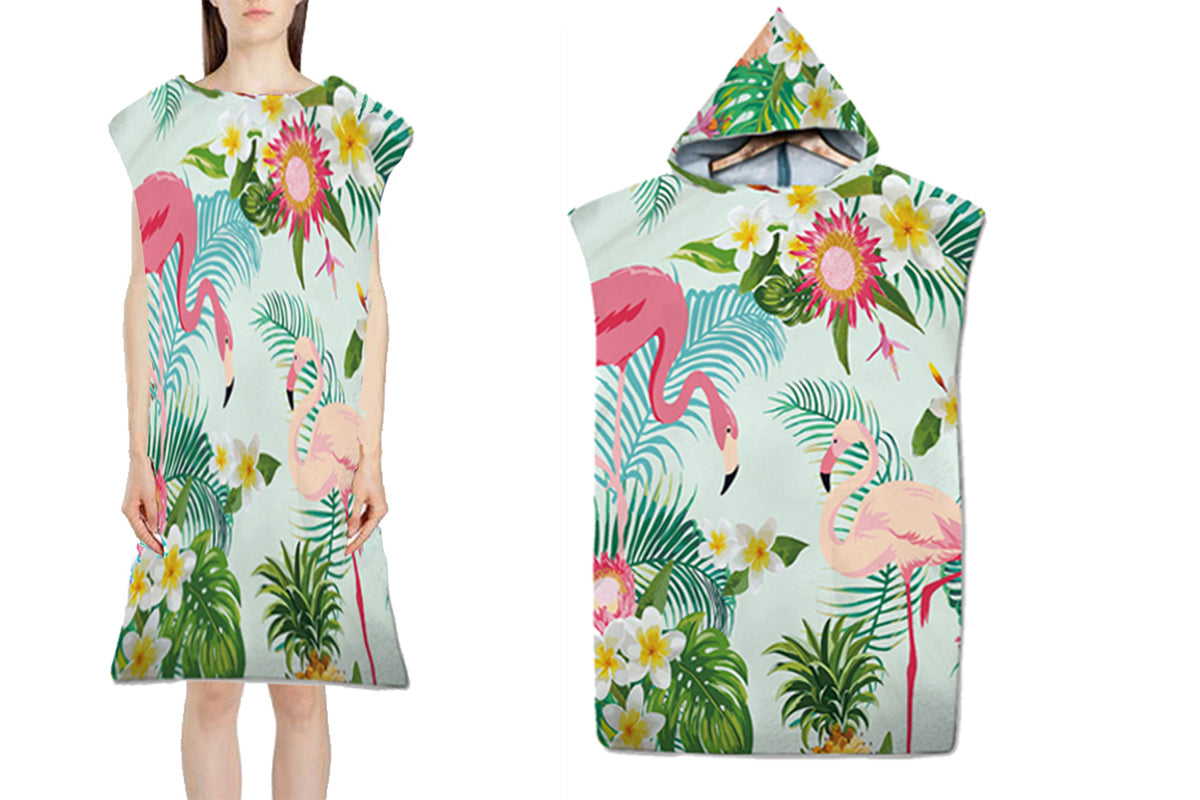 The surf swim robe poncho towel is your personal changing room, featuring flamingo patterns and bright colours