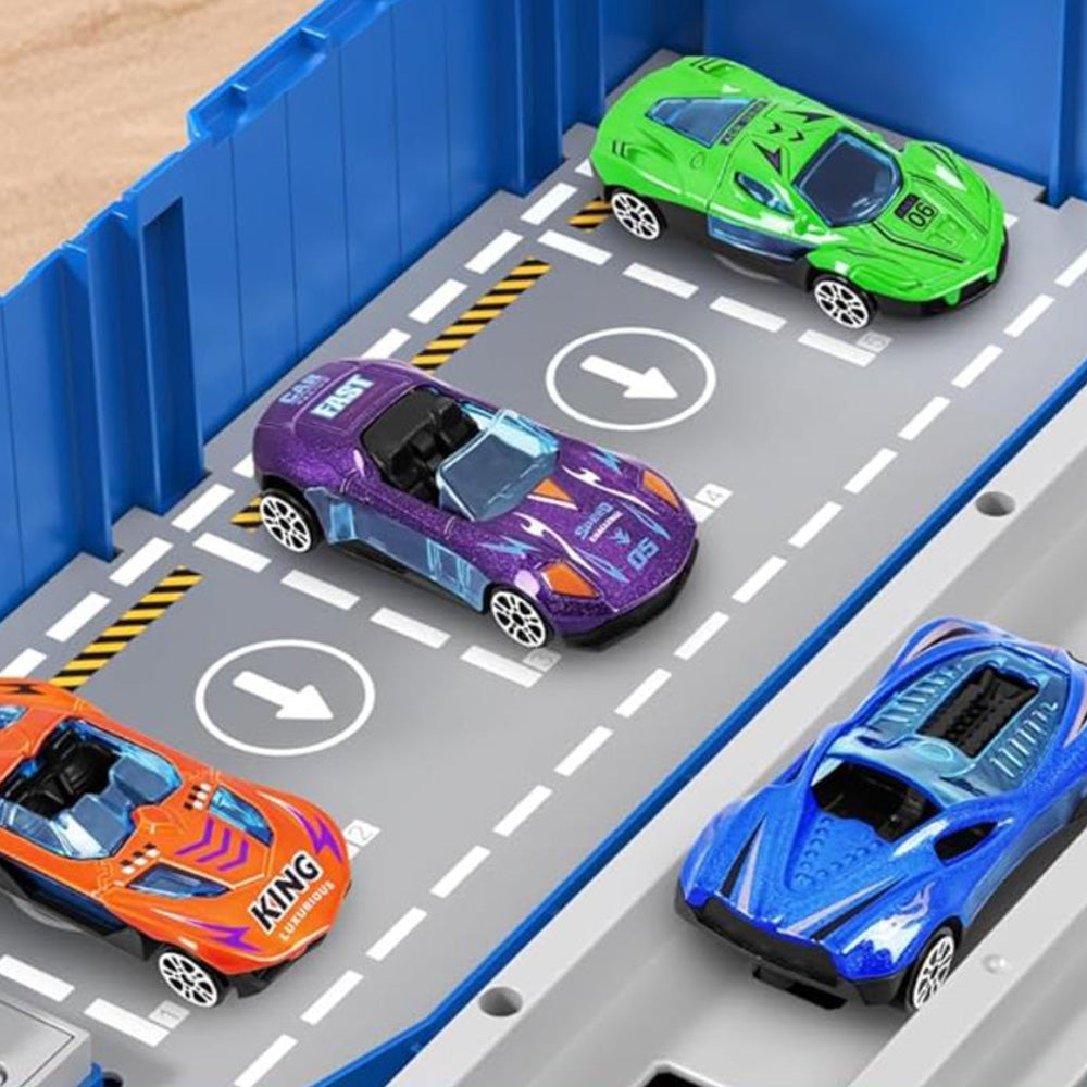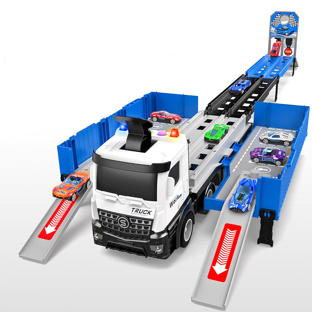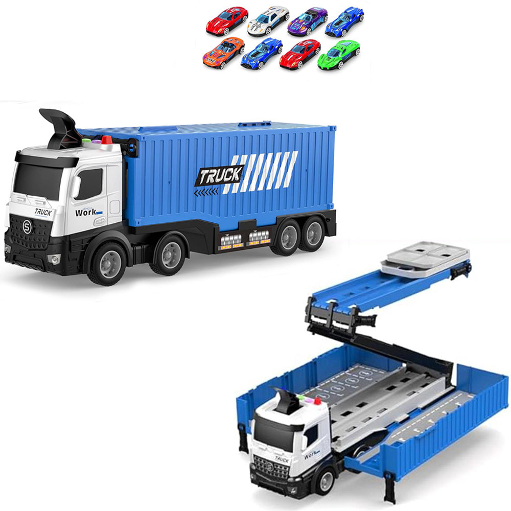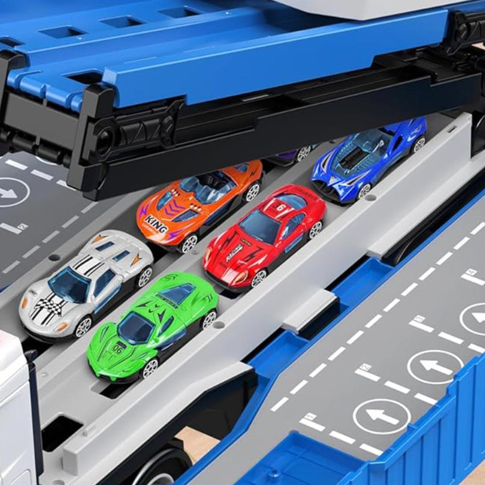 Transform Carrier Truck Race Track Toys with 8 Mini Race Cars Blue