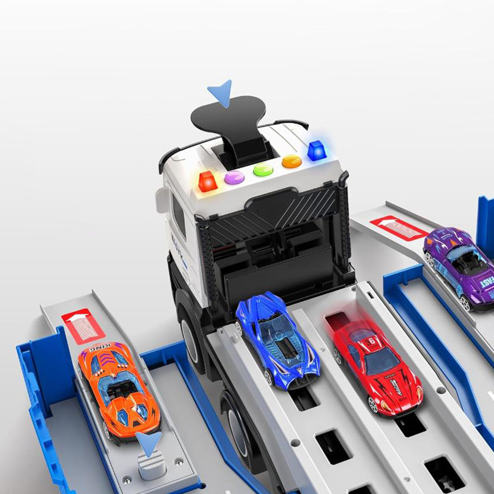 - This transport truck ideas a foldable design, it features a catapult track container car and a storage compartment for 8pcs colorful die-cast race cars.