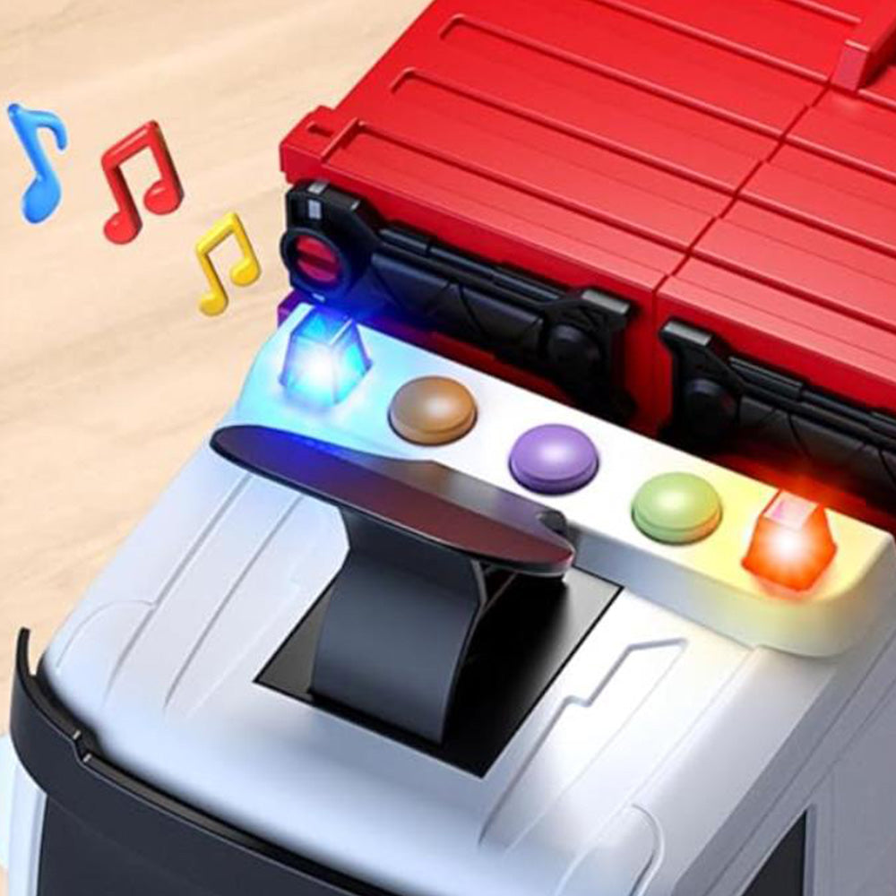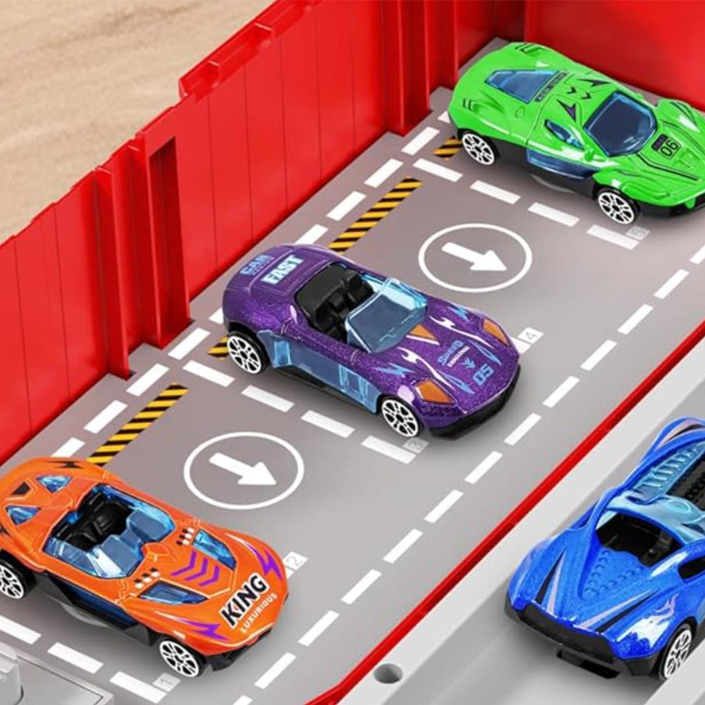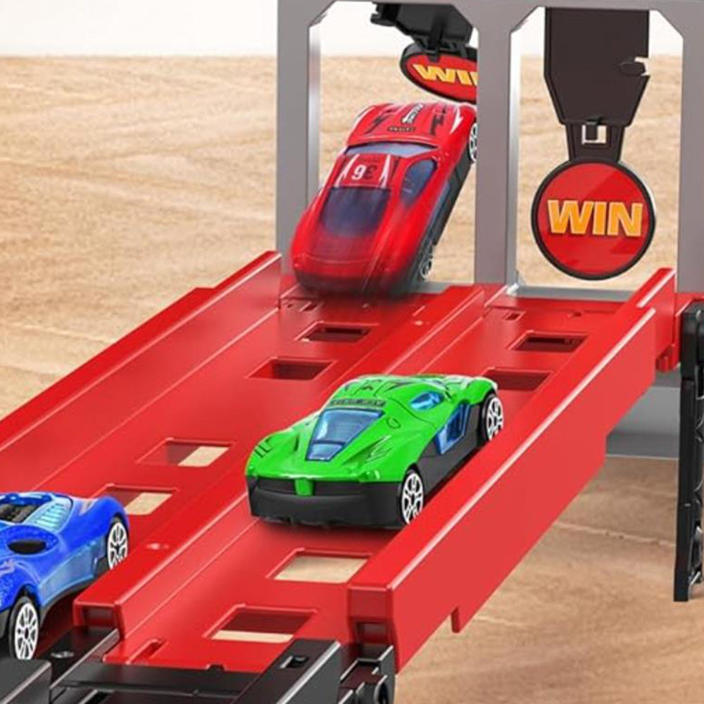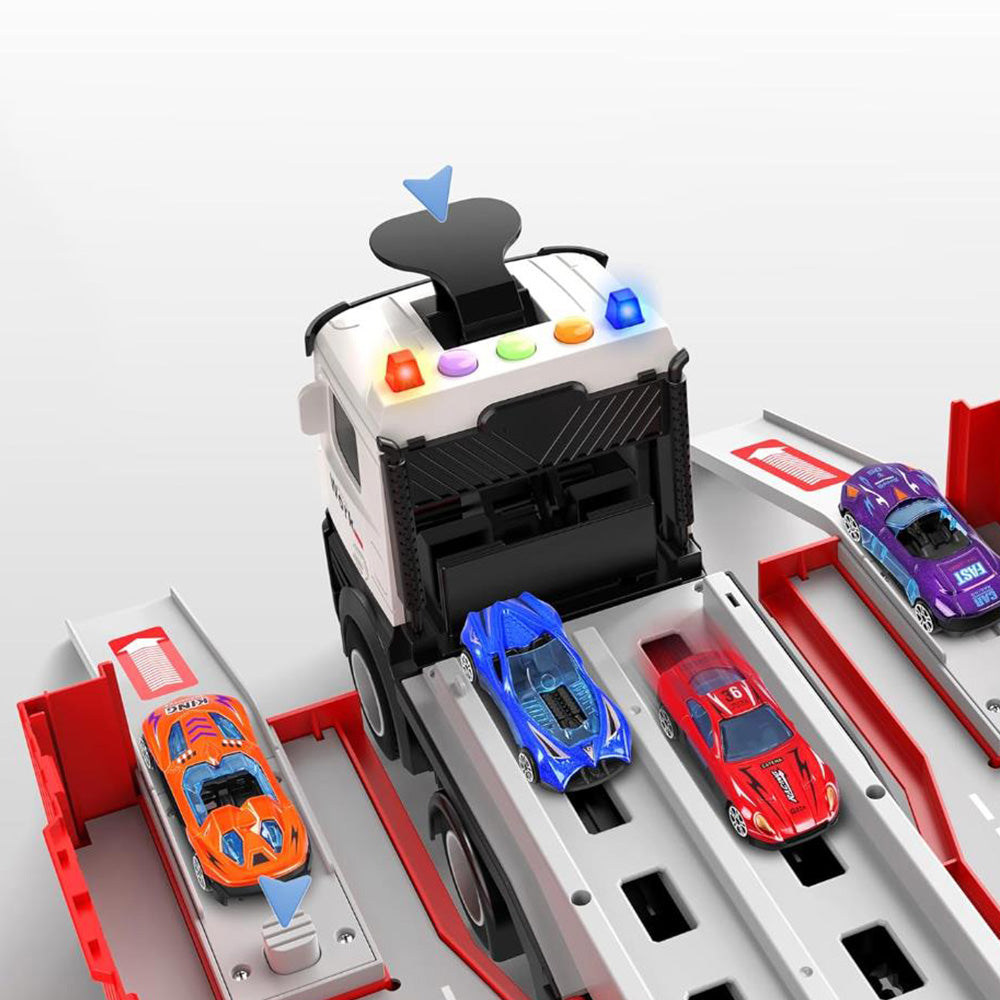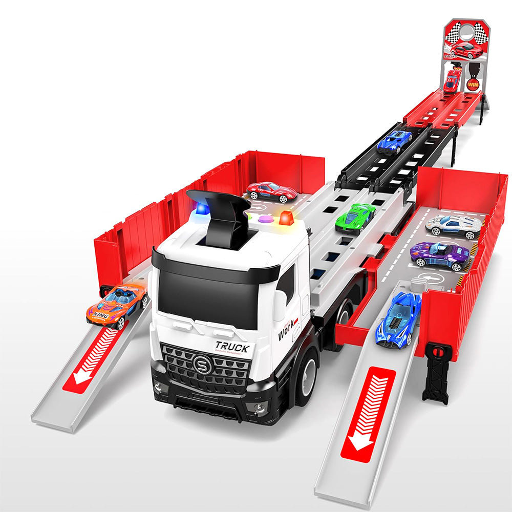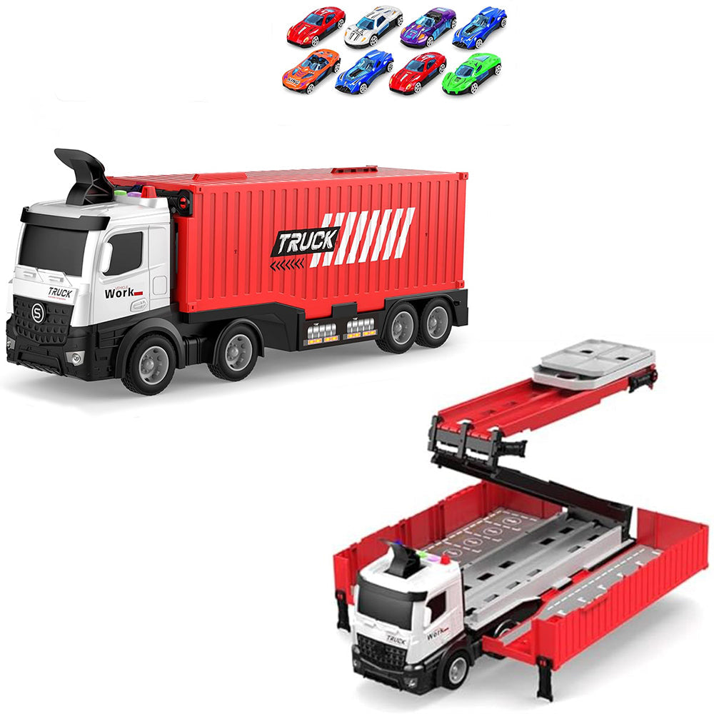 - This transport truck ideas a foldable design, it features a catapult track container car and a storage compartment for 8pcs colorful die-cast race cars.
