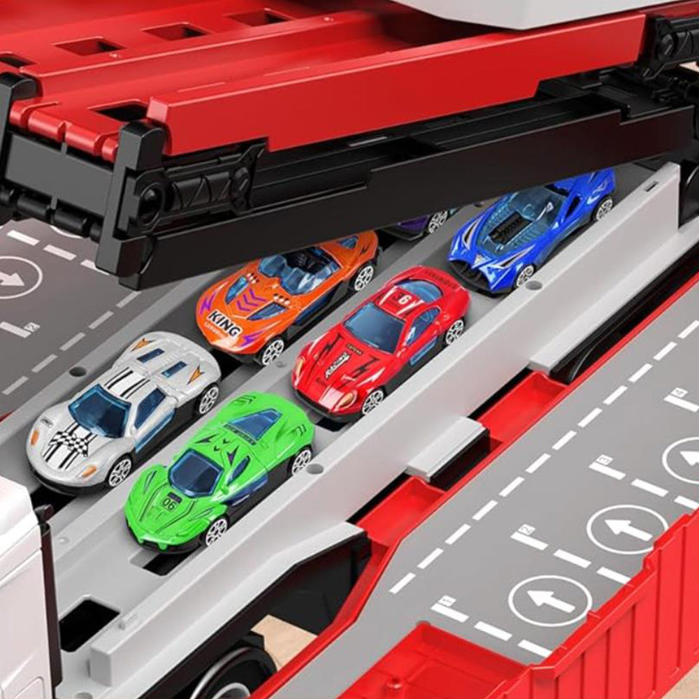 Transform Carrier Truck Race Track Toys with 8 Mini Race Cars Red
