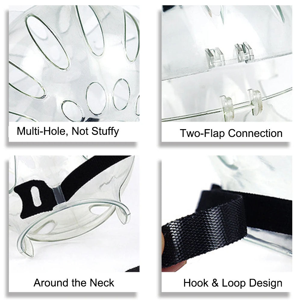 Adjustable cat hood with fully transparent and porous design can effectively prevent cats from biting, licking and struggling.