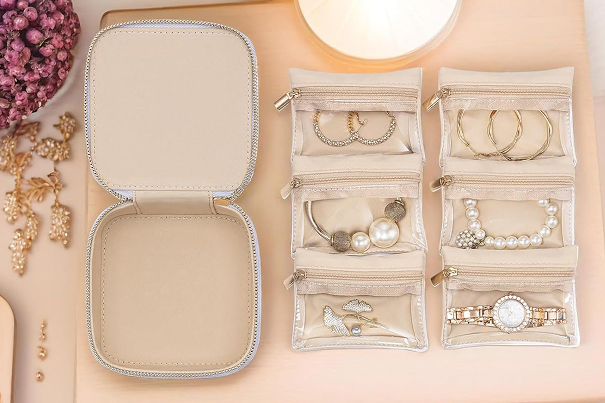 Travel Jewelry Case Small Jewelry Box with 6 Transparent Zipper Pockets-Beige