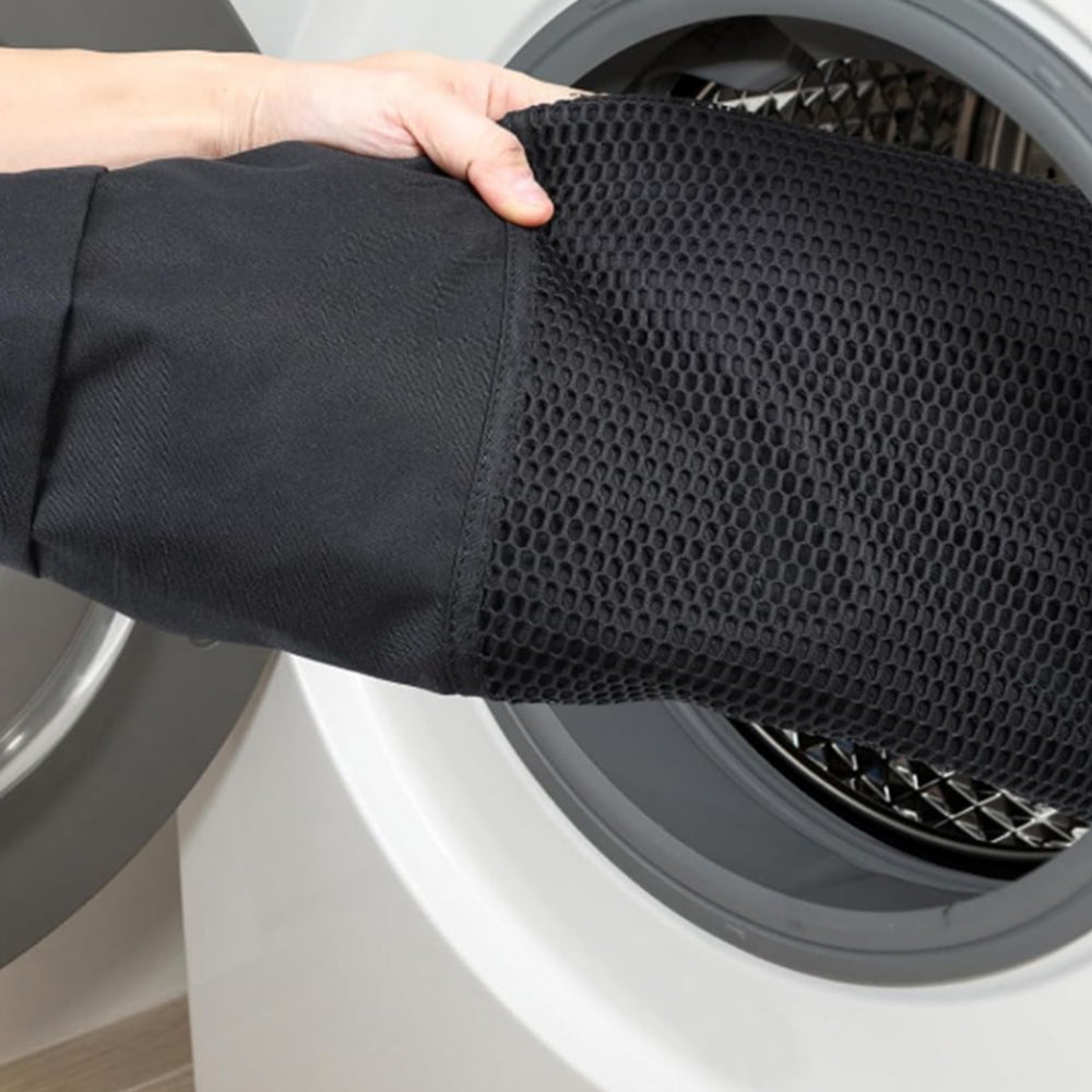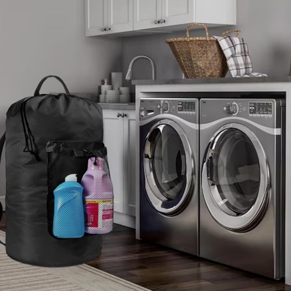 - The exterior mesh pocket can store laundry detergent, disinfectant, fabric softener, and other laundry supplies.