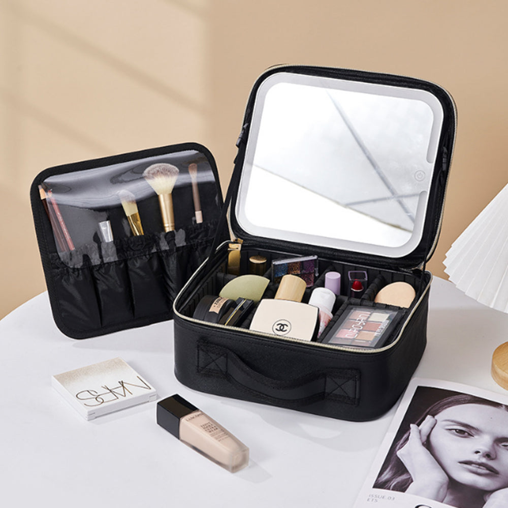 This travel makeup bag offers ample space for your cosmetics and includes a built-in mirror with adjustable lighting, making it perfect for applying makeup anytime, anywhere.