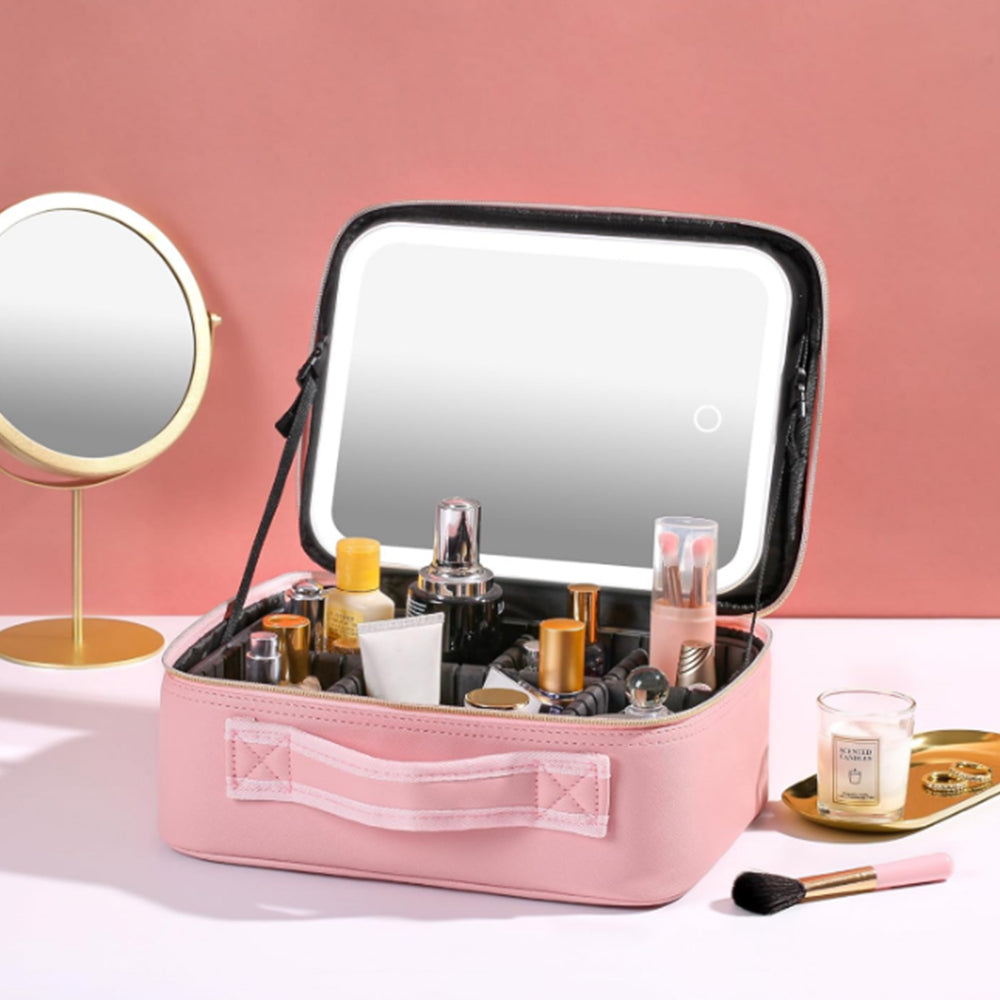 This travel makeup bag offers ample space for your cosmetics and includes a built-in mirror with adjustable lighting, making it perfect for applying makeup anytime, anywhere.