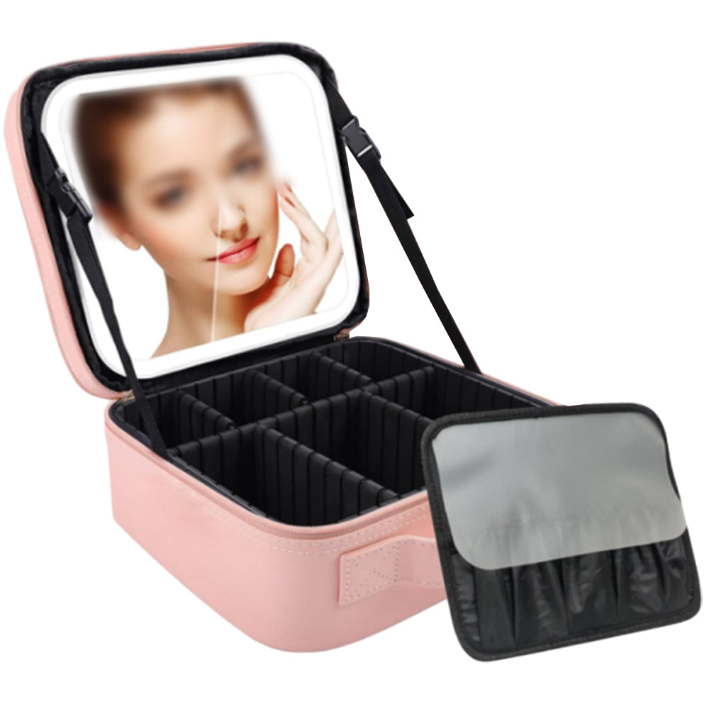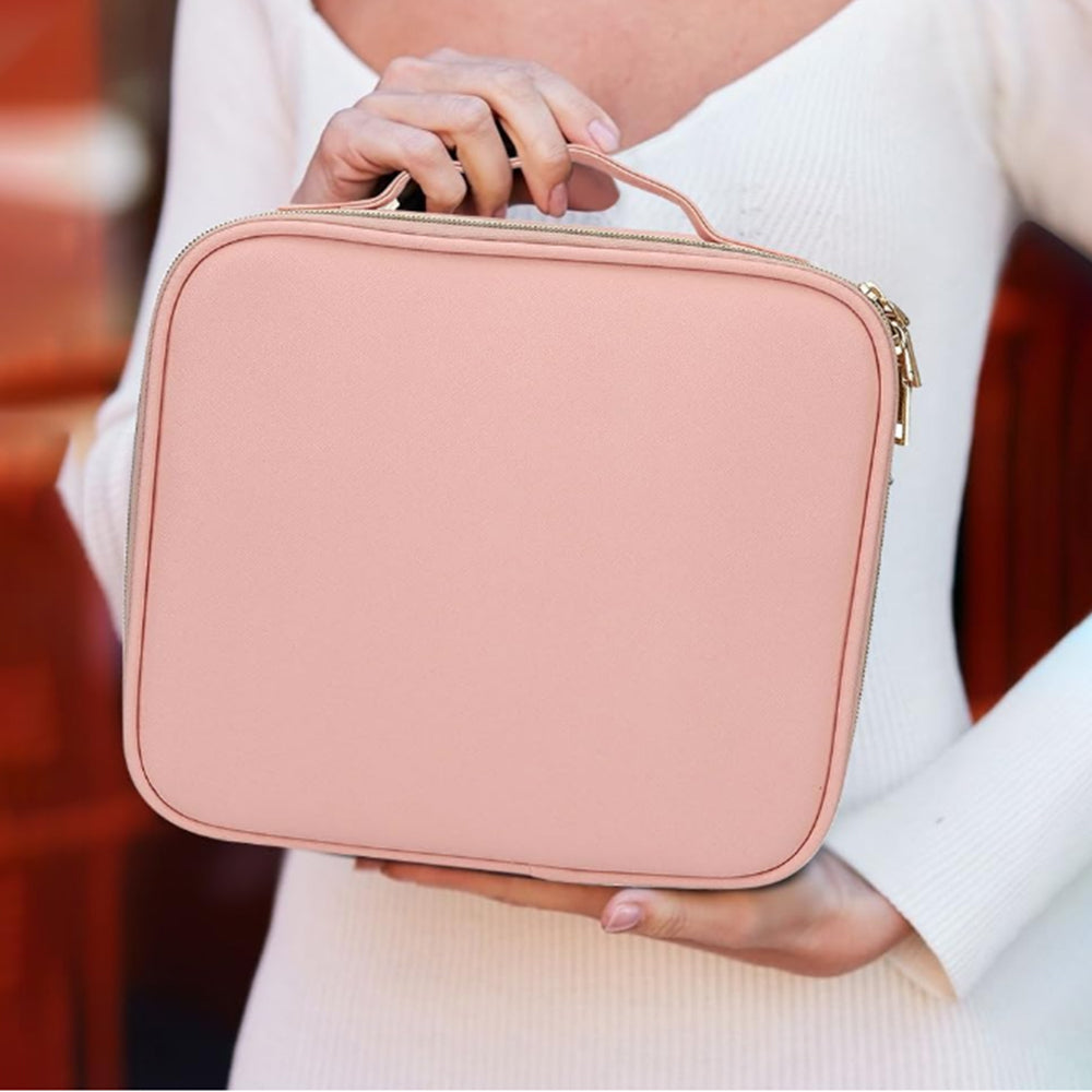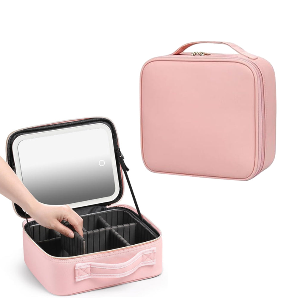 Travel Makeup Bag with Lighted Mirror Cosmetic Train Case with Adjustable Dividers Pink