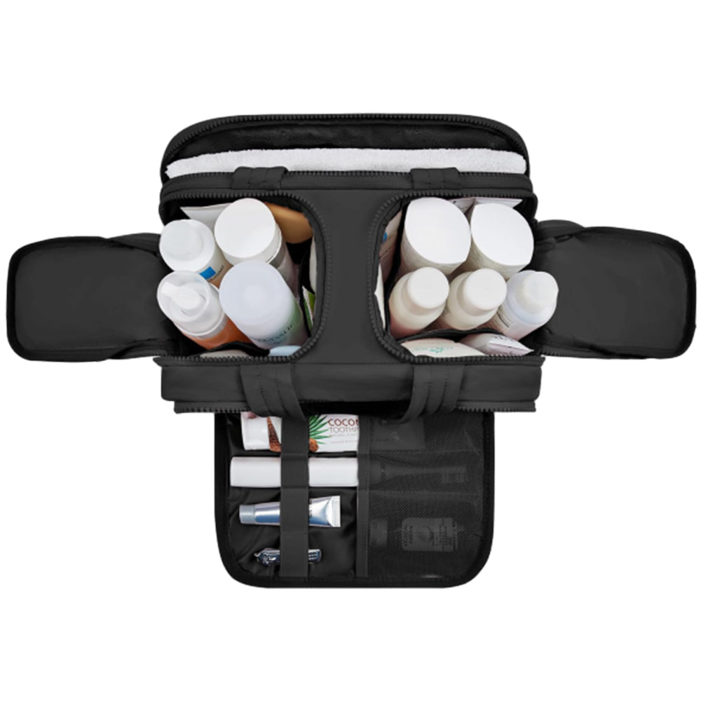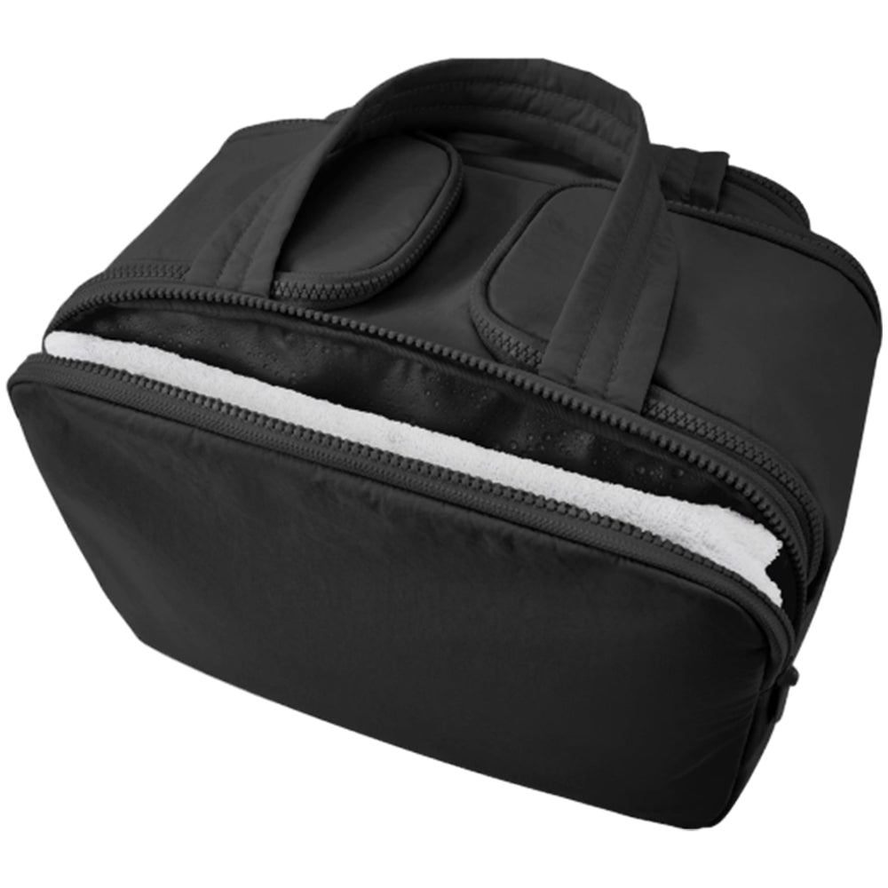 - Features a front pocket and a back pocket designed for storing wet items like towels and toothbrush, keeping them separate from other contents.