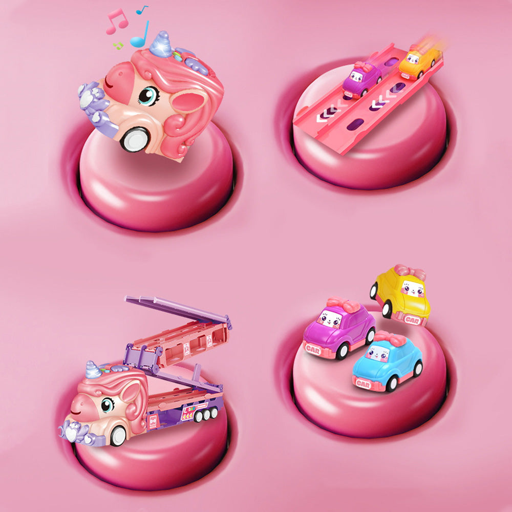 This unicorn toy truck transforms into a dual racetrack with lights and sound, offering interactive racing fun and early learning for kids.