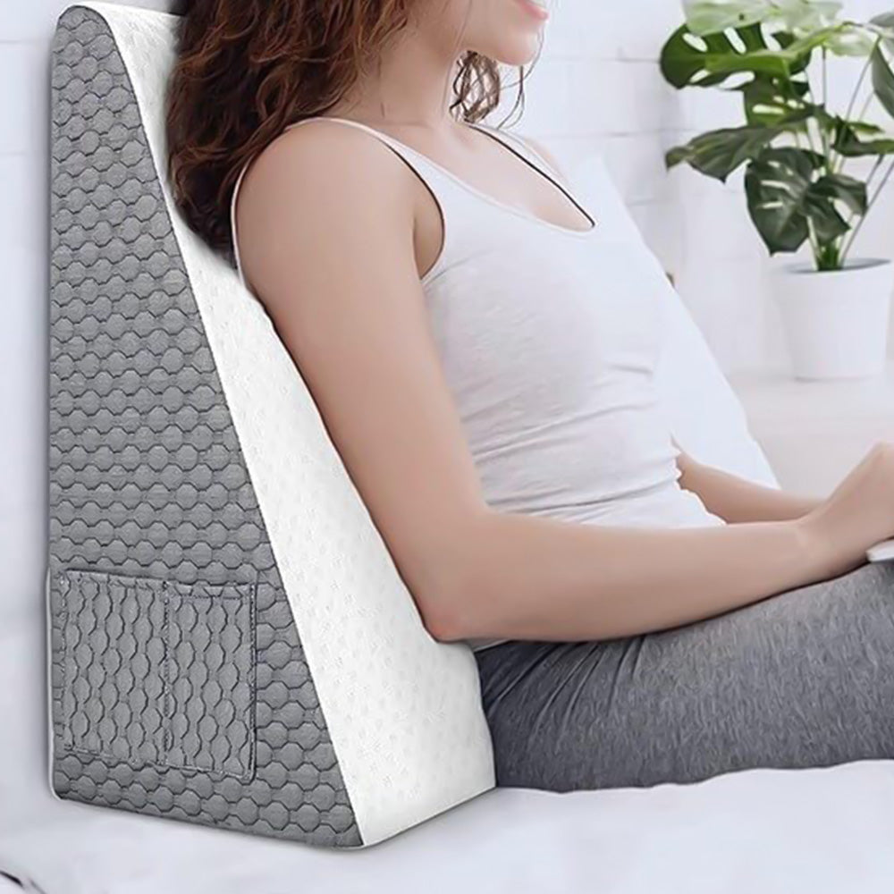 Ergonomic wedge pillow with medium firmness, designed for backrest, sleeping, and leg support to provide comfort and pressure relief.