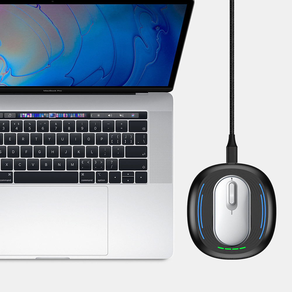 - When in use, place the mouse on the device aligning the mouse sensor light with the rotating disc.