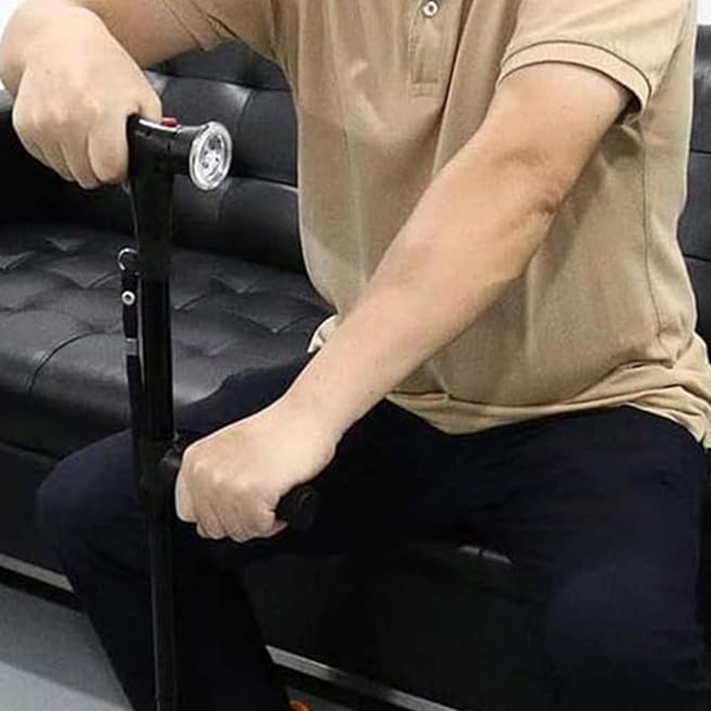 A foldable walking cane with LED light, built-in alarm, and ergonomic dual handles—designed for enhanced support, visibility, and safety during daily use.