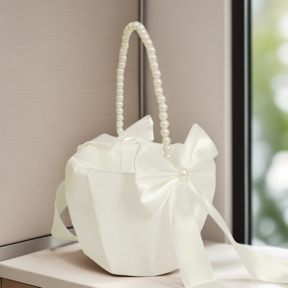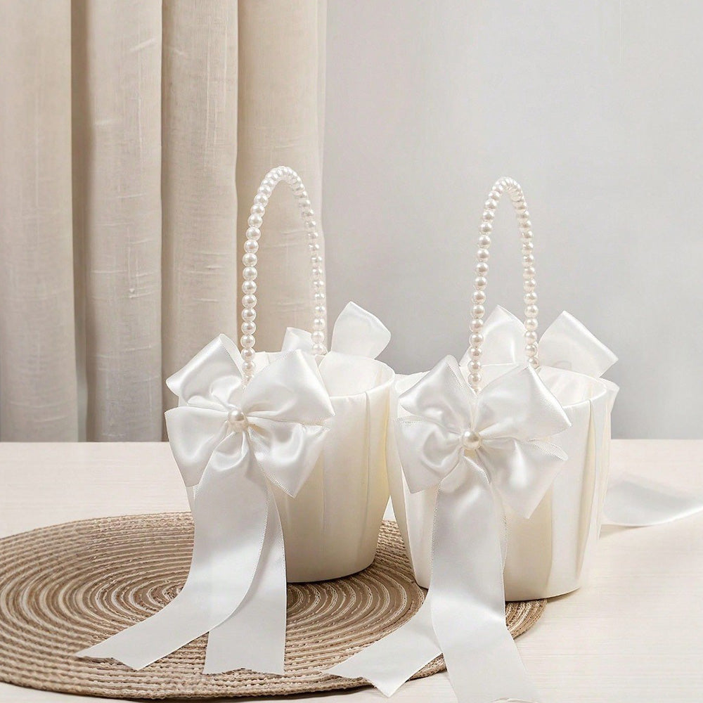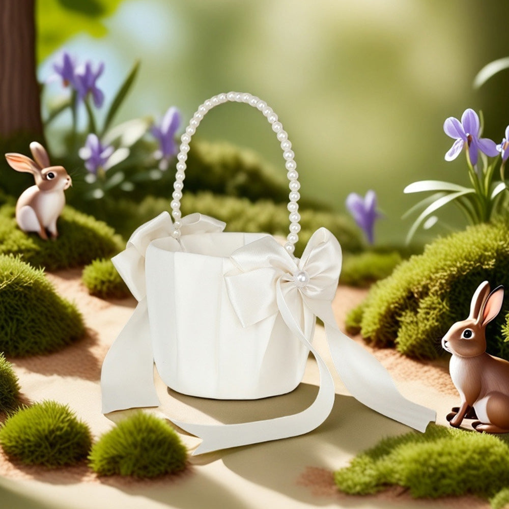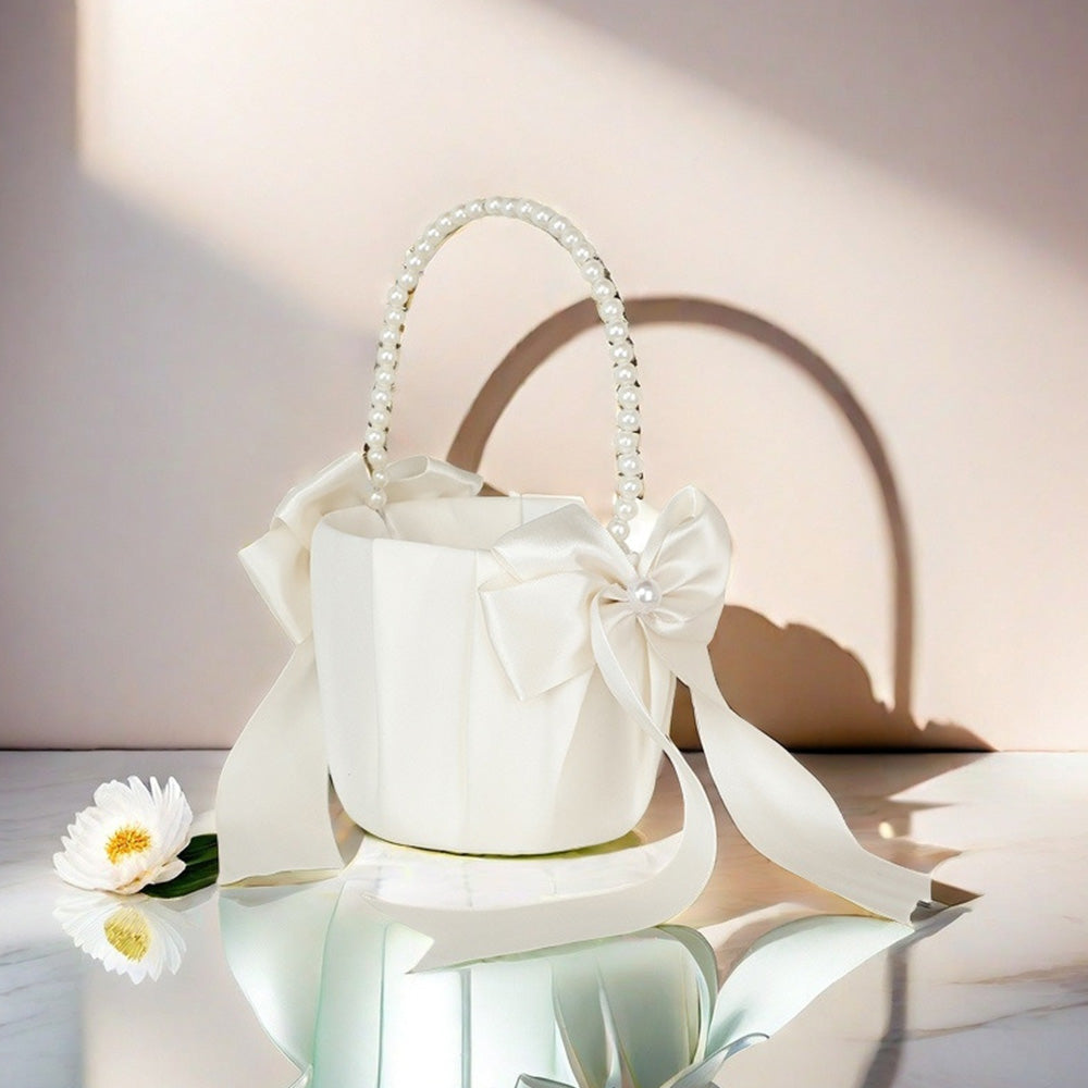 Exquisitely handcrafted flower basket with a pearl handle and satin bowknot, perfect for adding a dreamy touch to your special day.