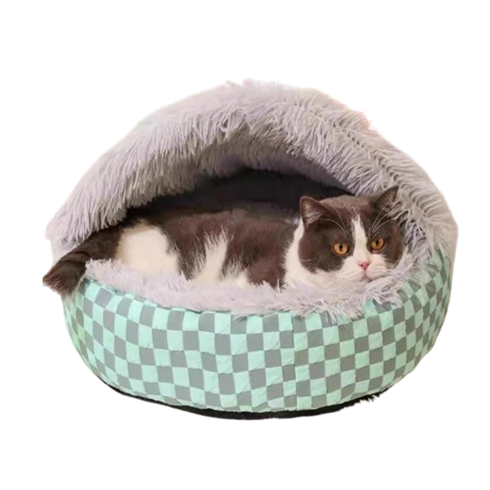 Designed to keep your pet warmer in winter, this plush-cushioned hooded pet bed features a non-skid bottom and a half-cave design.