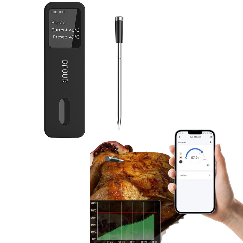 - Extended Wireless Range for Convenience: Designed with a strong Bluetooth connection, the probe maintains stable transmission even from a distance. When the grill is closed, the thermometer remains functional within a 3m range, while in open spaces, it can maintain a connection up to 30m.