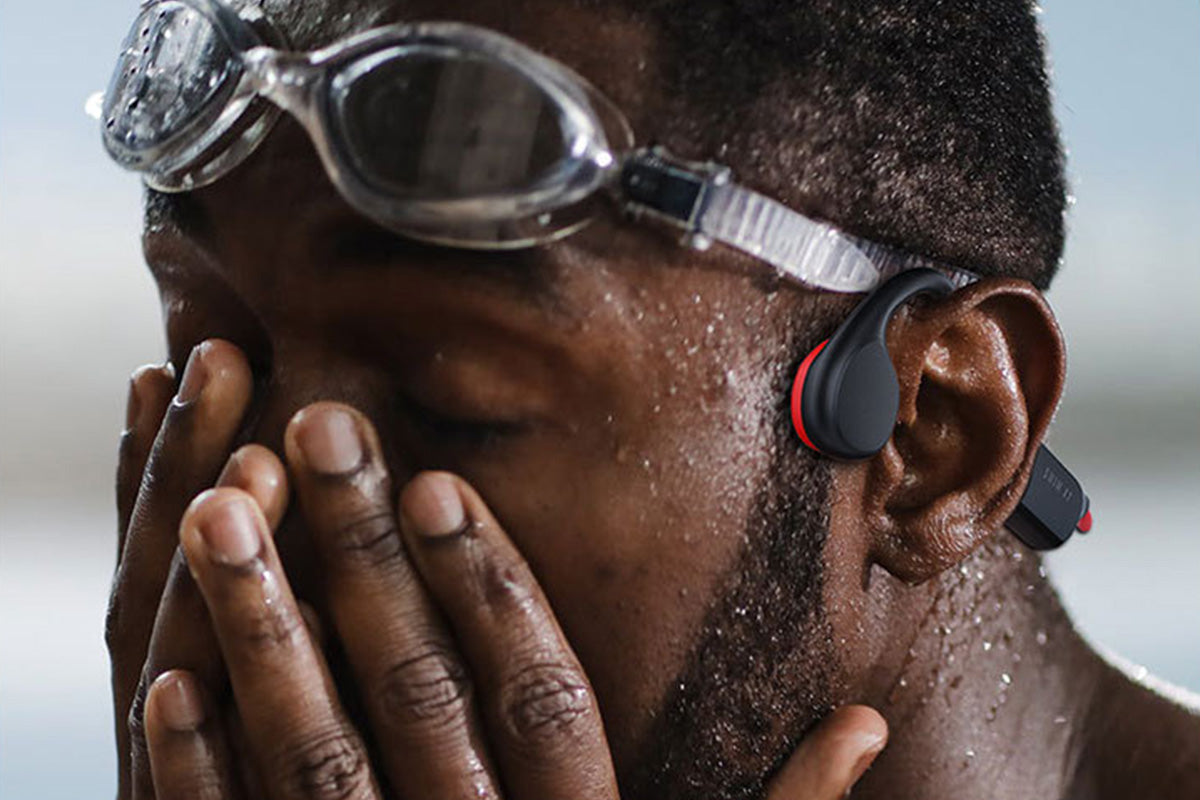 Wireless bone conduction earphones with IPX8 water-resistance, designed for swimming and providing high-quality sound without the need for in-ear placement.