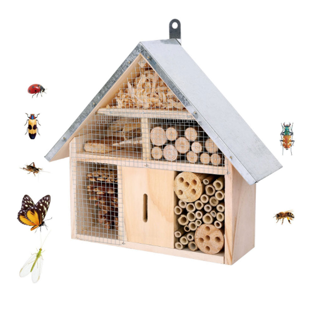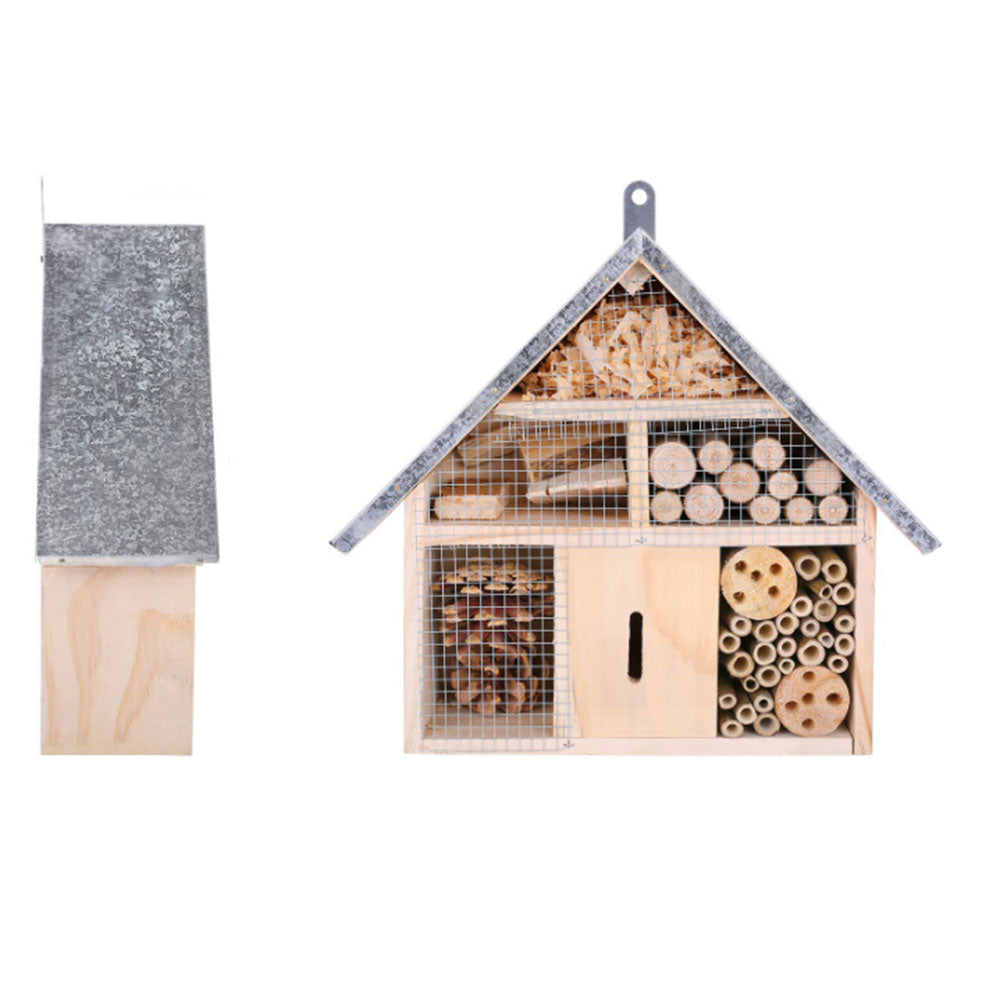 - The metal roof is designed to offer durability and weather resistance, protecting the insect hotel from the elements and ensuring a long-lasting shelter for beneficial insects.
