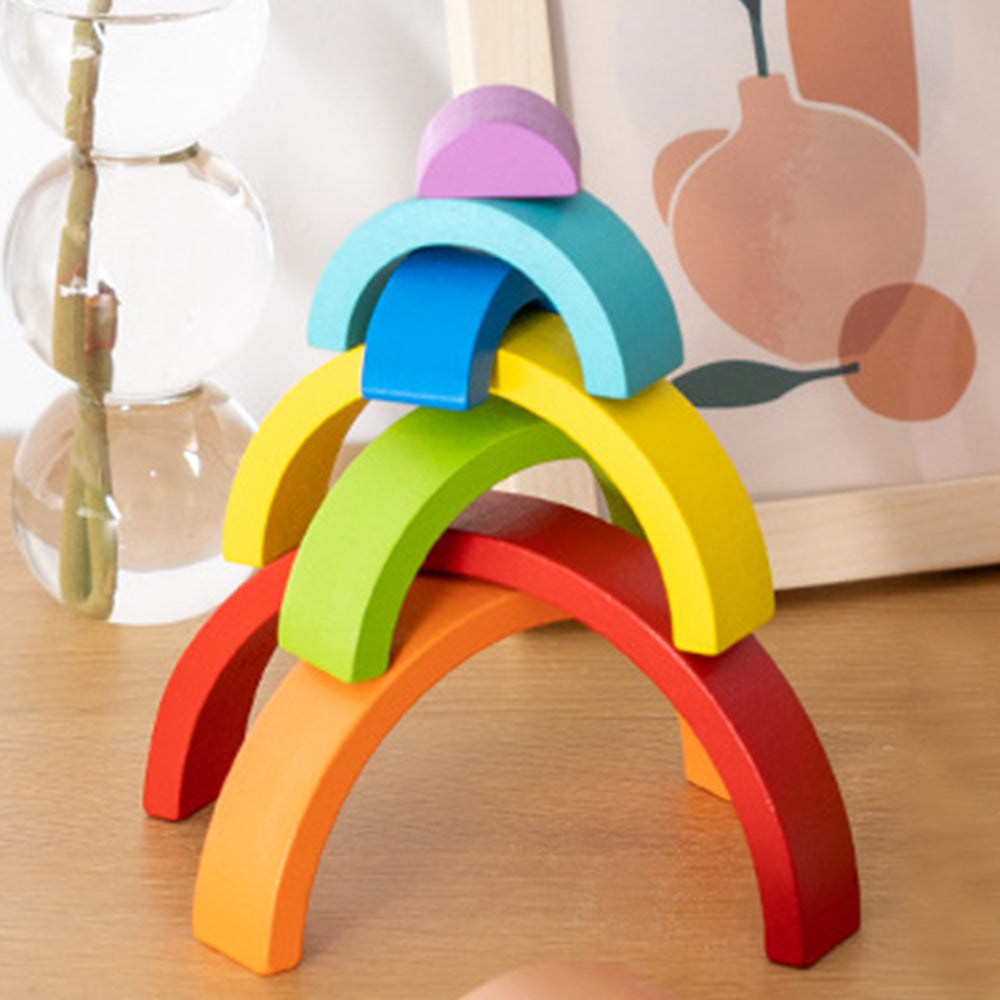 - Set includes 7pcs different vibrantly colored wooden pieces with separate sizes.
