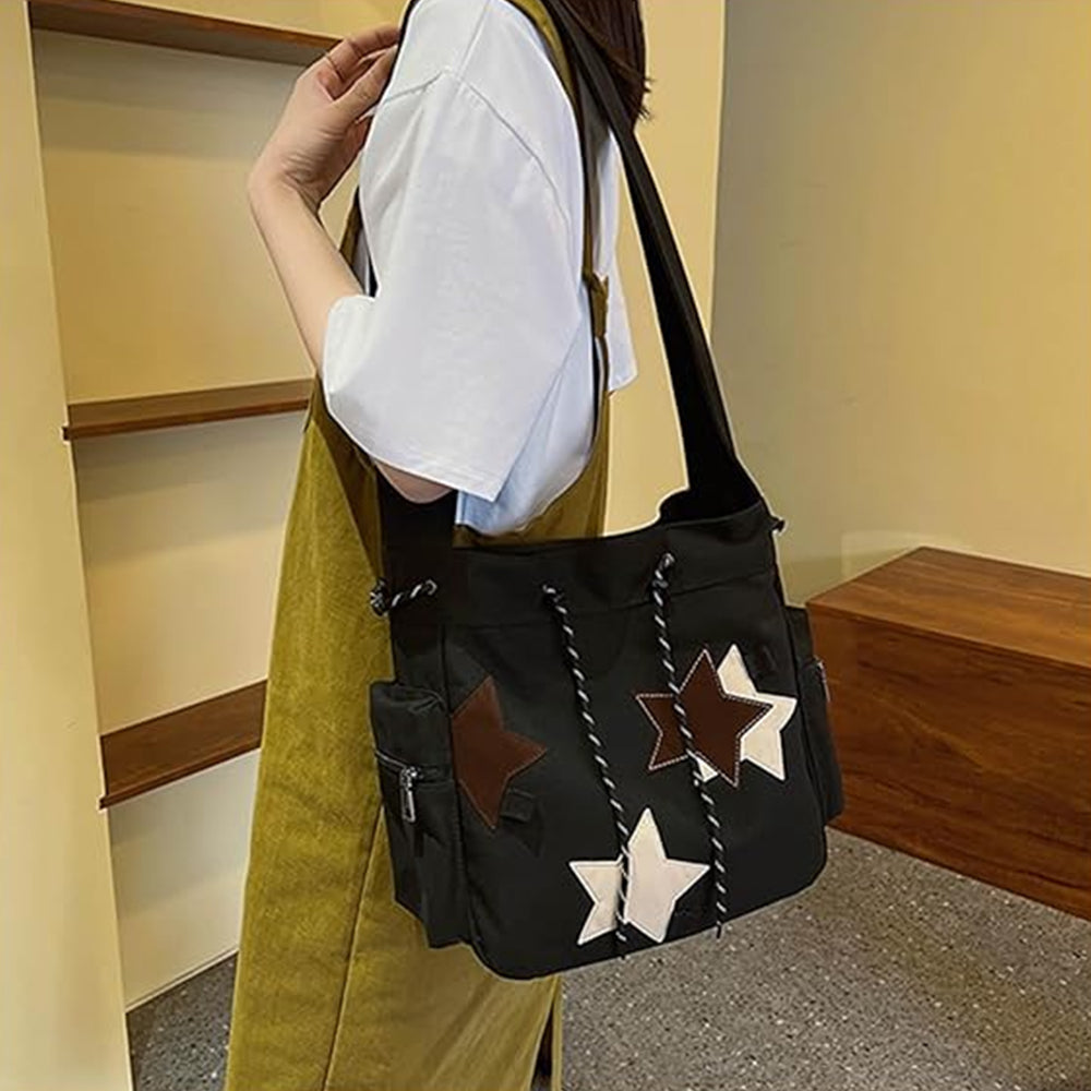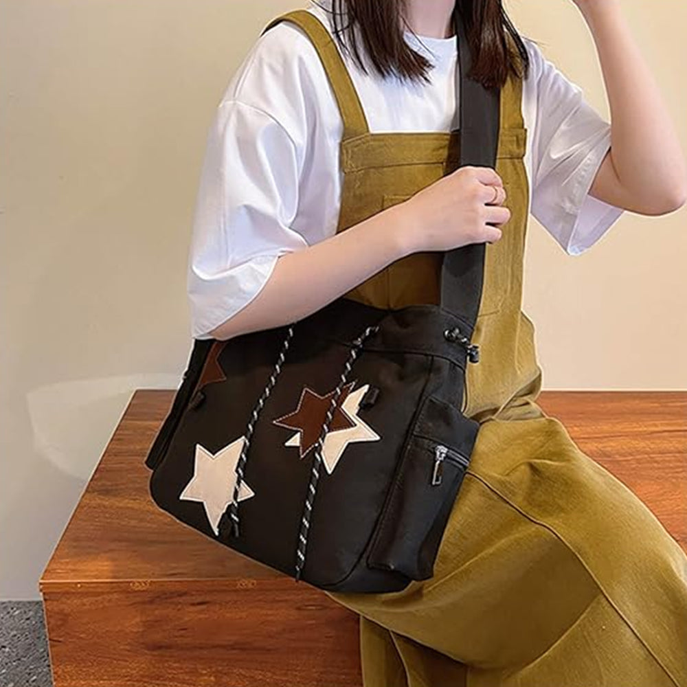 Y2K Canvas Messenger Bag Star Tote Bags Shoulder Travel Crossbody Bags for Women Black
