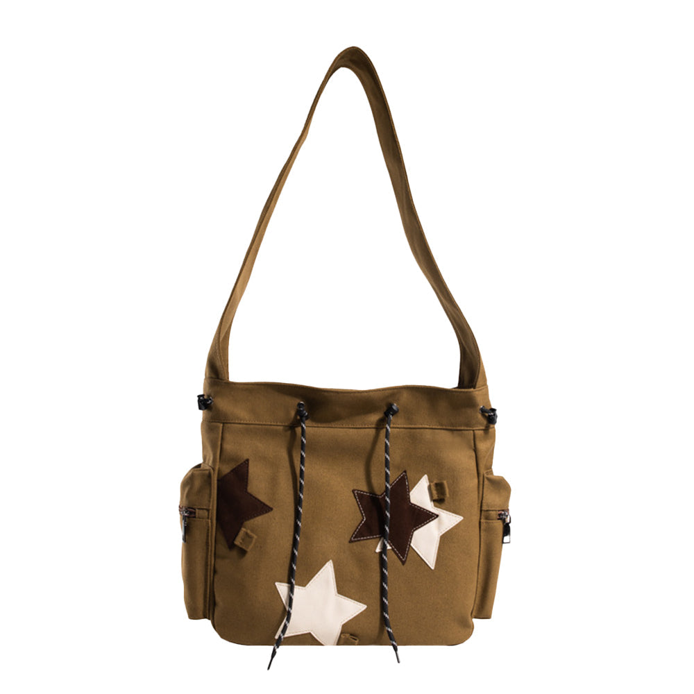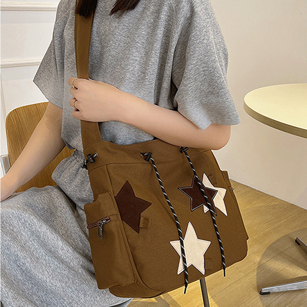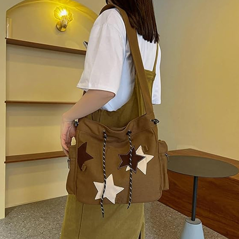 Y2K Canvas Messenger Bag Star Tote Bags Shoulder Travel Crossbody Bags for Women Brown
